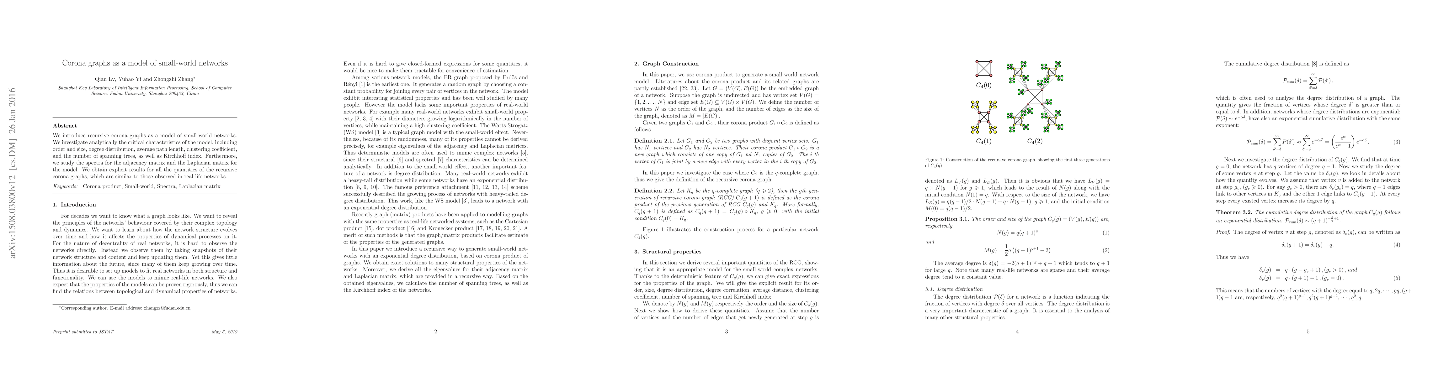 This paper introduces recursive corona graphs as a model of small-world networks, revealing characteristics similar to real-life networks, including degree distribution, path length, clustering coefficient, and spanning tree numbers.