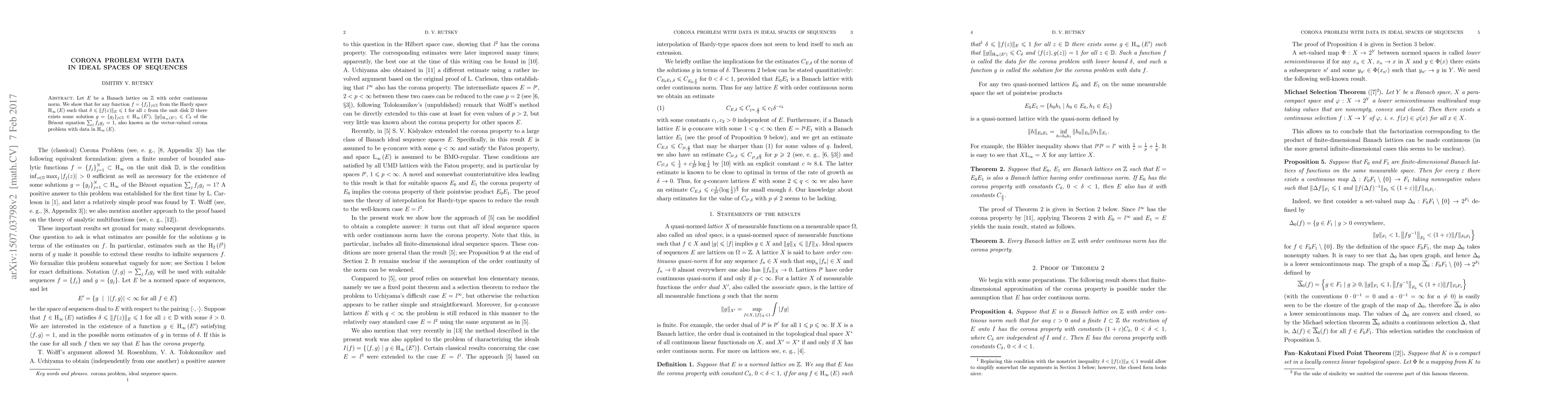 This paper addresses the vector-valued corona problem in ideal spaces of sequences, proving that for any function $f$ in the Hardy space $H_\infty (E)$ with bounded norm on the unit disk, there exists a solution $g$ in $H_\infty (E')$ satisfying the B\'ezout equation with a bounded norm dependent on $f$.