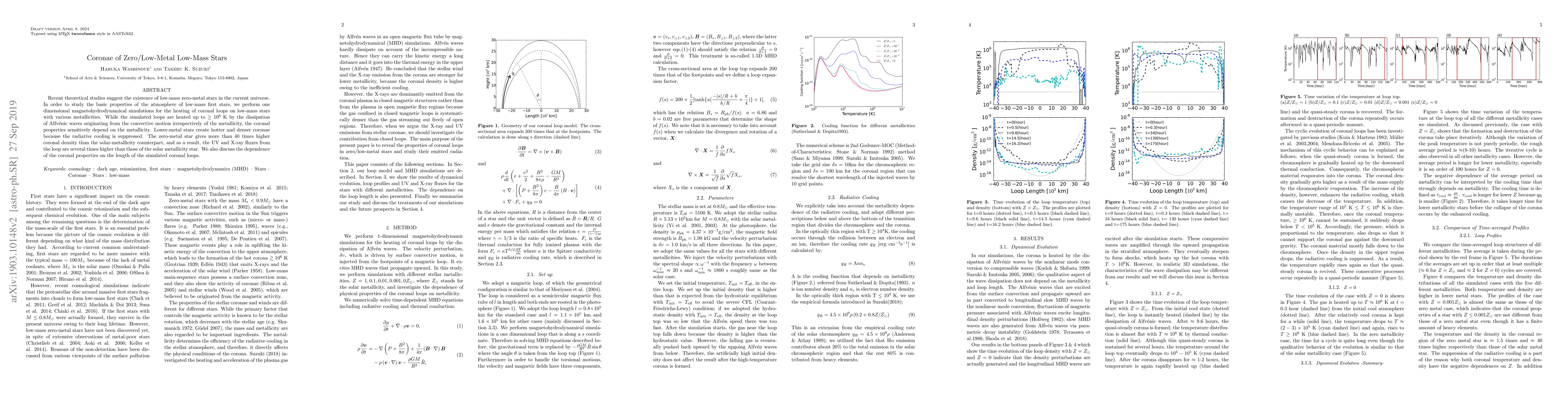 Recent theoretical studies suggest the existence of low-mass zero-metal stars in the current universe. In order to study the basic properties of the atmosphere of low-mass first stars, we performed one dimensional magnetohydrodynamical simulations for the heating of coronal loops on low-mass stars with various metallicities. While the simulated loops are heated up to >$10^6$ K by the dissipation of Alfvenic waves originating from the convective motion irrespectively of the metallicity, the coronal properties sensitively depend on the metallicity. Lower-metal stars create hotter and denser coronae because the radiative cooling is suppressed. The zero-metal star gives more than ten times higher coronal density than the solar-metallicity counterpart, and as a result, the UV and X-ray fluxes from the loop are (1-5) times higher than those of the solar metallicity star. We also discuss the dependence of the coronal properties on the length of the simulated coronal loops
