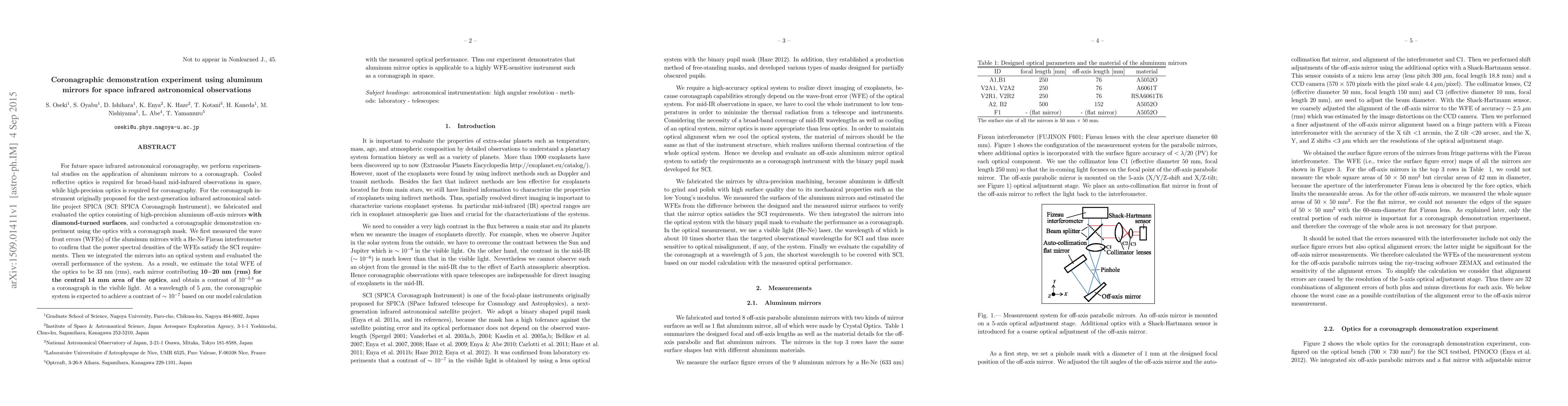 For future space infrared astronomical coronagraphy, we perform experimental studies on the application of aluminum mirrors to a coronagraph. Cooled reflective optics is required for broad-band mid-infrared observations in space, while high-precision optics is required for coronagraphy. For the coronagraph instrument originally proposed for the next-generation infrared astronomical satellite project SPICA (SCI: SPICA Coronagraph Instrument), we fabricated and evaluated the optics consisting of high-precision aluminum off-axis mirrors with diamond-turned surfaces, and conducted a coronagraphic demonstration experiment using the optics with a coronagraph mask. We first measured the wave front errors (WFEs) of the aluminum mirrors with a He-Ne Fizeau interferometer to confirm that the power spectral densities of the WFEs satisfy the SCI requirements. Then we integrated the mirrors into an optical system and evaluated the overall performance of the system. As a result, we estimate the total WFE of the optics to be 33 nm (rms), each mirror contributing 10-20 nm (rms) for the central 14 mm area of the optics, and obtain a contrast of 10^(-5.4) as a coronagraph in the visible light. At a wavelength of 5 um, the coronagraphic system is expected to achieve a contrast of ~10^(-7) based on our model calculation with the measured optical performance. Thus our experiment demonstrates that aluminum mirror optics is applicable to a highly WFE-sensitive instrument such as a coronagraph in space.