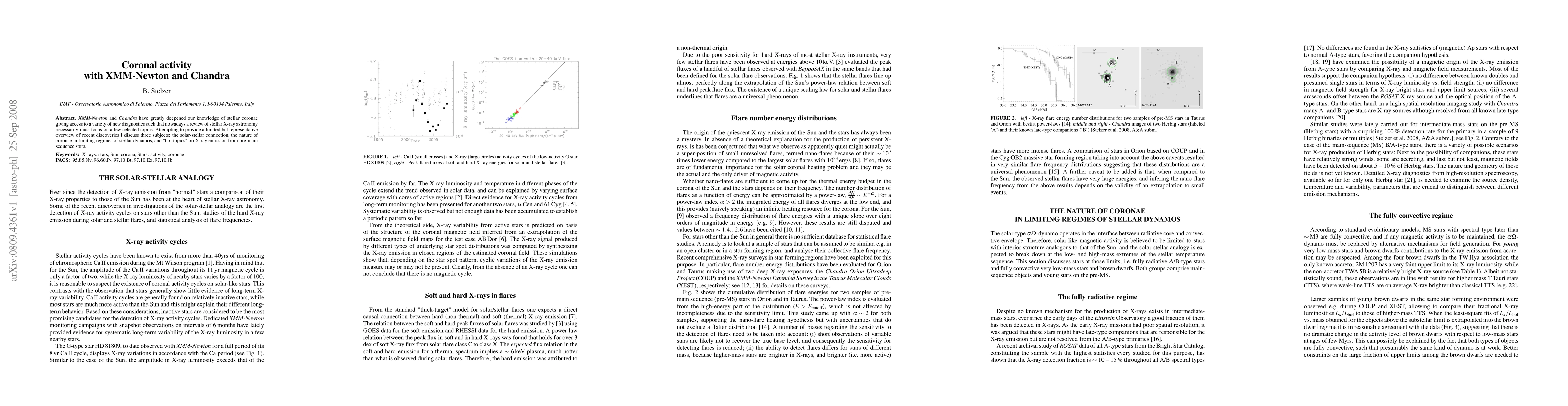 This paper reviews recent advancements in stellar X-ray astronomy using XMM-Newton and Chandra, focusing on the solar-stellar connection, coronae in extreme stellar dynamo conditions, and X-ray emissions from pre-main sequence stars. The study highlights significant discoveries in these selected areas.