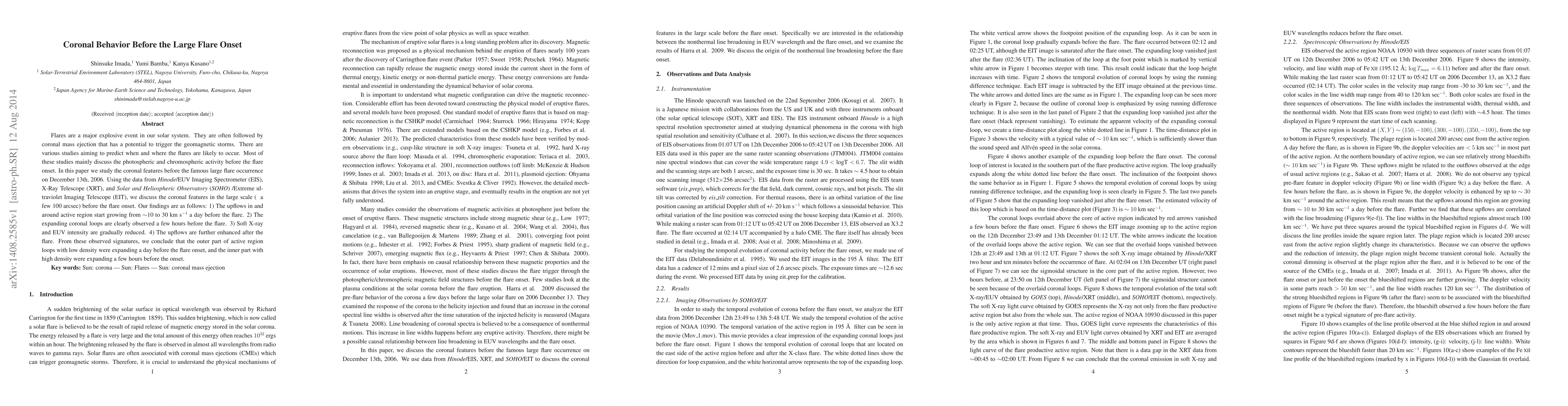 Flares are a major explosive event in our solar system. They are often followed by coronal mass ejection that has a potential to trigger the geomagnetic storms. There are various studies aiming to predict when and where the flares are likely to occur. Most of these studies mainly discuss the photospheric and chromospheric activity before the flare onset. In this paper we study the coronal features before the famous large flare occurrence on December 13th, 2006. Using the data from Hinode/EUV Imaging Spectrometer (EIS), X-Ray Telescope (XRT), and Solar and Heliospheric Observatory (SOHO) /Extreme ultraviolet Imaging Telescope (EIT), we discuss the coronal features in the large scale (~ a few 100 arcsec) before the flare onset. Our findings are as follows: 1) The upflows in and around active region start growing from ~10 to 30 km /s a day before the flare. 2) The expanding coronal loops are clearly observed a few hours before the flare. 3) Soft X-ray and EUV intensity are gradually reduced. 4) The upflows are further enhanced after the flare. From these observed signatures, we conclude that the outer part of active region loops with low density were expanding a day before the flare onset, and the inner part with high density were expanding a few hours before the onset.