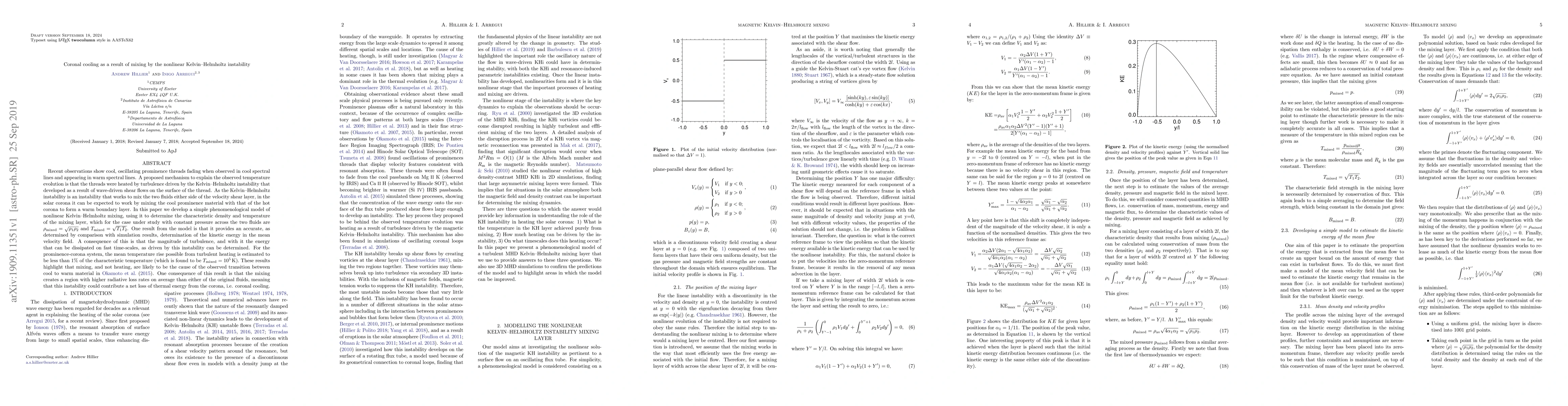 Recent observations show cool, oscillating prominence threads fading when observed in cool spectral lines and appearing in warm spectral lines. A proposed mechanism to explain this evolution is that the threads were heated by turbulence driven by the Kelvin--Helmholtz instability that developed as a result of wave-driven shear flows on the surface of the thread. As the Kelvin--Helmholtz instability is an instability that works to mix the fluids, in the solar corona it can be expected to work by mixing the cool prominence material with that of the hot corona to form a warm boundary layer. In this paper we develop a simple phenomenological model of nonlinear Kelvin--Helmholtz mixing, using it to determine the characteristic density and temperature of the mixing layer, which for the case under study with constant pressure across the two fluids are $\rho_{\rm mixed}=\sqrt{\rho_1\rho_2}$ and $T_{\rm mixed}=\sqrt{T_1T_2}$. One result from the model is that it provides an accurate, as determined by comparison with simulation results, determination of the kinetic energy in the mean velocity field. A consequence of this is that the magnitude of turbulence, and with it the energy that can be dissipated on fast time-scales, as driven by this instability can be determined. For the prominence-corona system, the mean temperature rise possible from turbulent heating is estimated to be less than 1\% of the characteristic temperature (which is found to be $10^5$\,K). These results highlight that mixing, and not heating, are likely to be the cause of the observed transition between cool to warm material in Okamoto et. al (2015). One consequence of this result is that the mixing creates a region with higher radiative loss rates on average than either of the original fluids, meaning that this instability could contribute a net loss of thermal energy from the corona, i.e. coronal cooling.