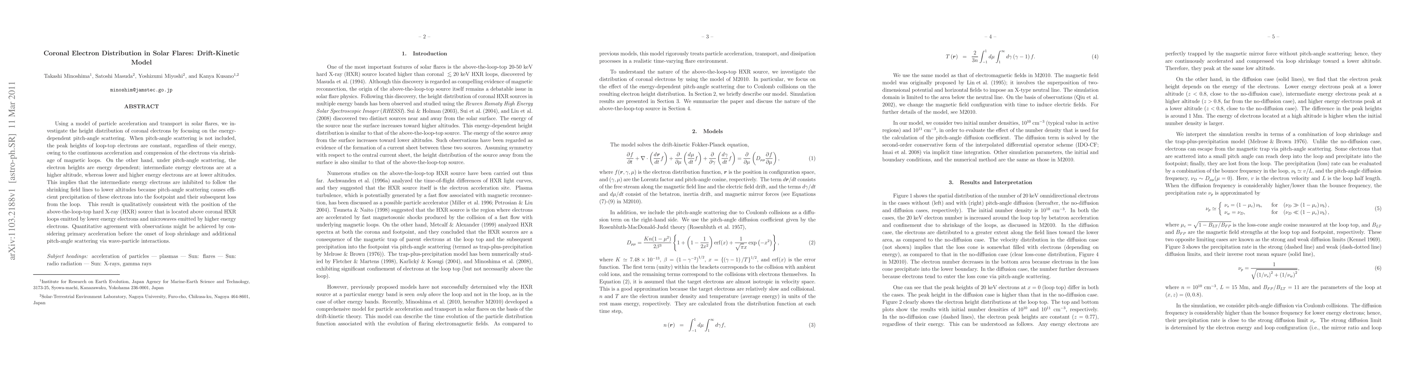 This paper investigates the height distribution of coronal electrons in solar flares using a drift-kinetic model, finding that pitch-angle scattering causes intermediate energy electrons to remain at higher altitudes compared to lower and higher energy electrons, which precipitate to lower altitudes. This model aligns with the observed position of the above-the-loop-top hard X-ray source.