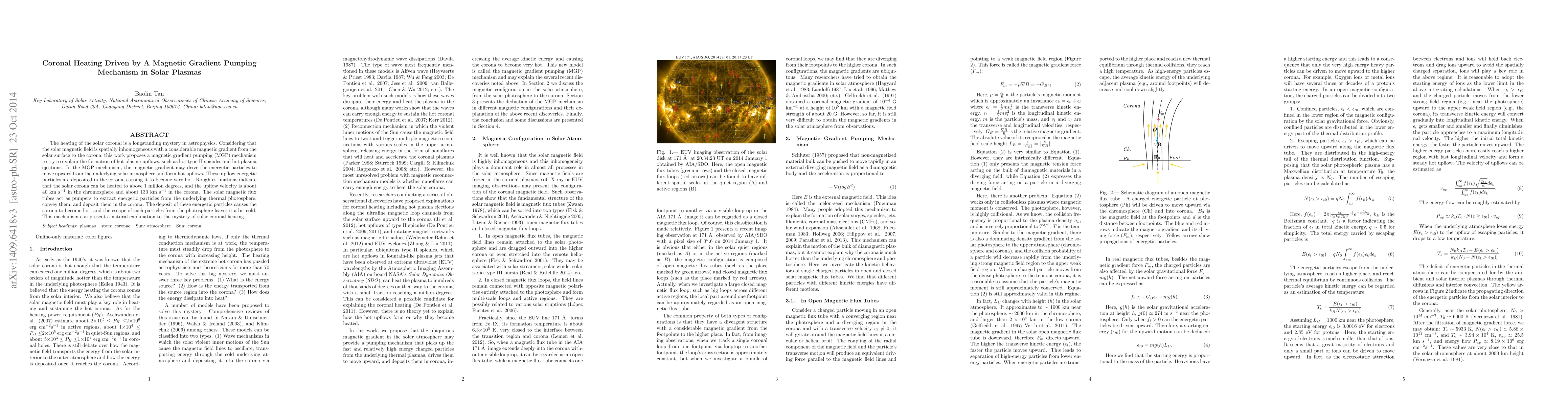This paper proposes a magnetic gradient pumping (MGP) mechanism to explain solar coronal heating, suggesting that magnetic gradients drive energetic particles upward from the solar atmosphere, forming hot plasma upflows and heating the corona to over 1 million degrees. The MGP mechanism uses solar magnetic flux tubes to extract and transport these particles, providing a solution to the longstanding mystery of coronal heating.