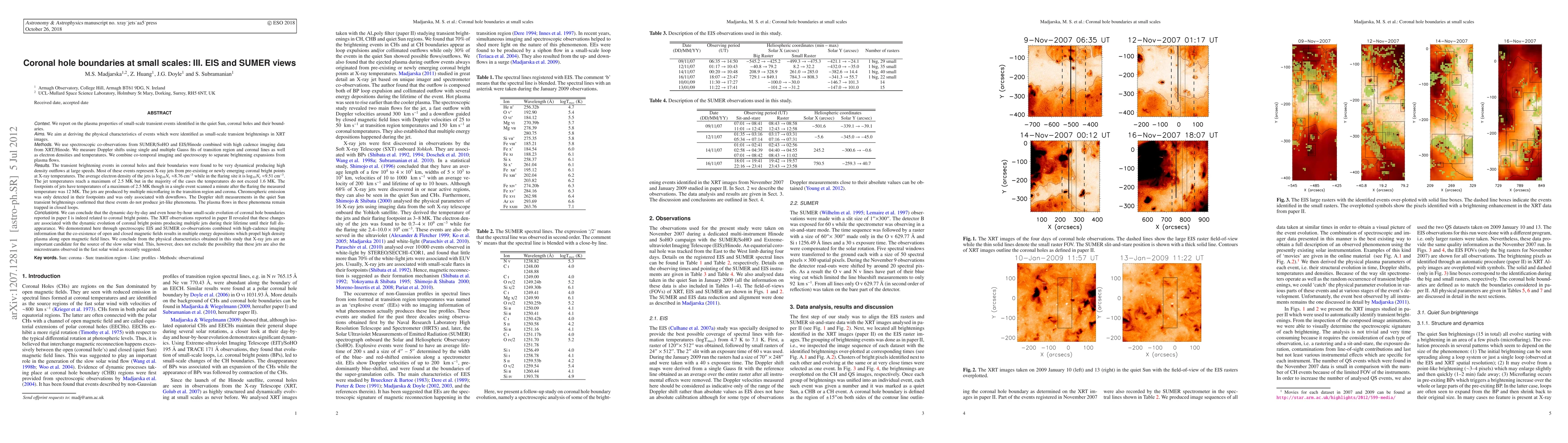 This study investigates small-scale transient events in coronal holes using combined data from SUMER, EIS, and XRT. It finds that transient brightening events, often X-ray jets, exhibit high-density outflows and temperatures up to 2.5 MK, with most events below 1.6 MK.