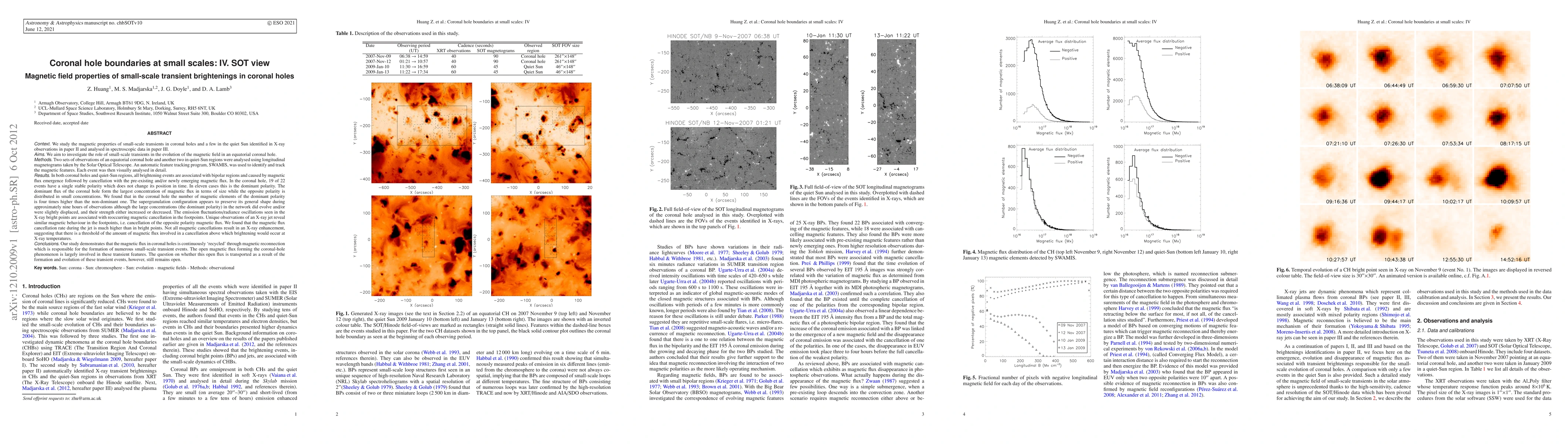 We study the magnetic properties of small-scale transients in coronal hole. We found all brightening events are associated with bipolar regions and caused by magnetic flux emergence followed by cancellation with the pre-existing and newly emerging magnetic flux. In the coronal hole, 19 of 22 events have a single stable polarity which does not change its position in time. In eleven cases this is the dominant polarity. The dominant flux of the coronal hole form the largest concentration of magnetic flux in terms of size while the opposite polarity is distributed in small concentrations. In the coronal hole the number of magnetic elements of the dominant polarity is four times higher than the non-dominant one. The supergranulation configuration appears to preserve its general shape during approximately nine hours of observations although the large concentrations in the network did evolve and were slightly displaced, and their strength either increased or decreased. The emission fluctuations seen in the X-ray bright points are associated with reoccurring magnetic cancellation in the footpoints. Unique observations of an X-ray jet reveal similar magnetic behaviour in the footpoints, i.e. cancellation of the opposite polarity magnetic flux. We found that the magnetic flux cancellation rate during the jet is much higher than in bright points. Not all magnetic cancellations result in an X-ray enhancement, suggesting that there is a threshold of the amount of magnetic flux involved in a cancellation above which brightening would occur at X-ray temperatures. Our study demonstrates that the magnetic flux in coronal holes is continuously recycled through magnetic reconnection which is responsible for the formation of numerous small-scale transient events. The open magnetic flux forming the coronal-hole phenomenon is largely involved in these transient features.
