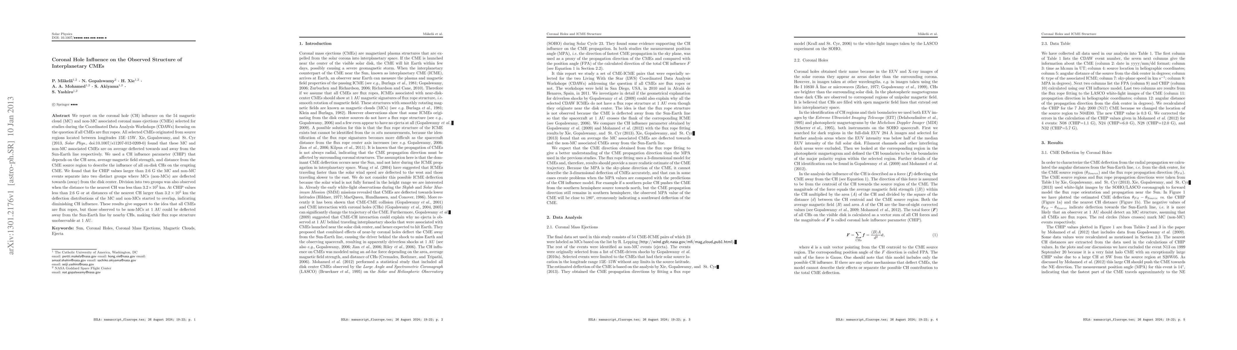 This paper investigates the influence of coronal holes on the structure and deflection of 54 interplanetary coronal mass ejections, finding that magnetic clouds are deflected towards the Sun-Earth line while non-magnetic clouds are deflected away when coronal hole influence is strong. The study supports the idea that all CMEs are flux ropes, but nearby coronal holes can obscure this structure in non-magnetic clouds.
