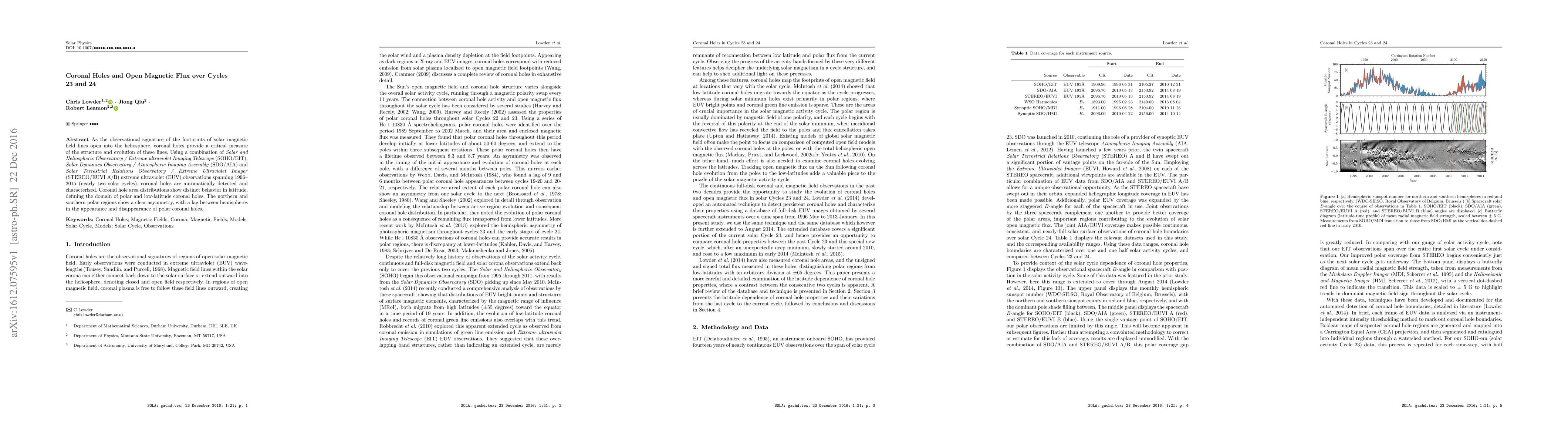 This study analyzes the evolution of coronal holes over solar cycles 23 and 24 using data from multiple solar observatories, revealing distinct latitudinal behaviors and asymmetries in the northern and southern polar regions. The findings highlight the importance of coronal holes in understanding the solar magnetic field's structure and its open flux distribution.