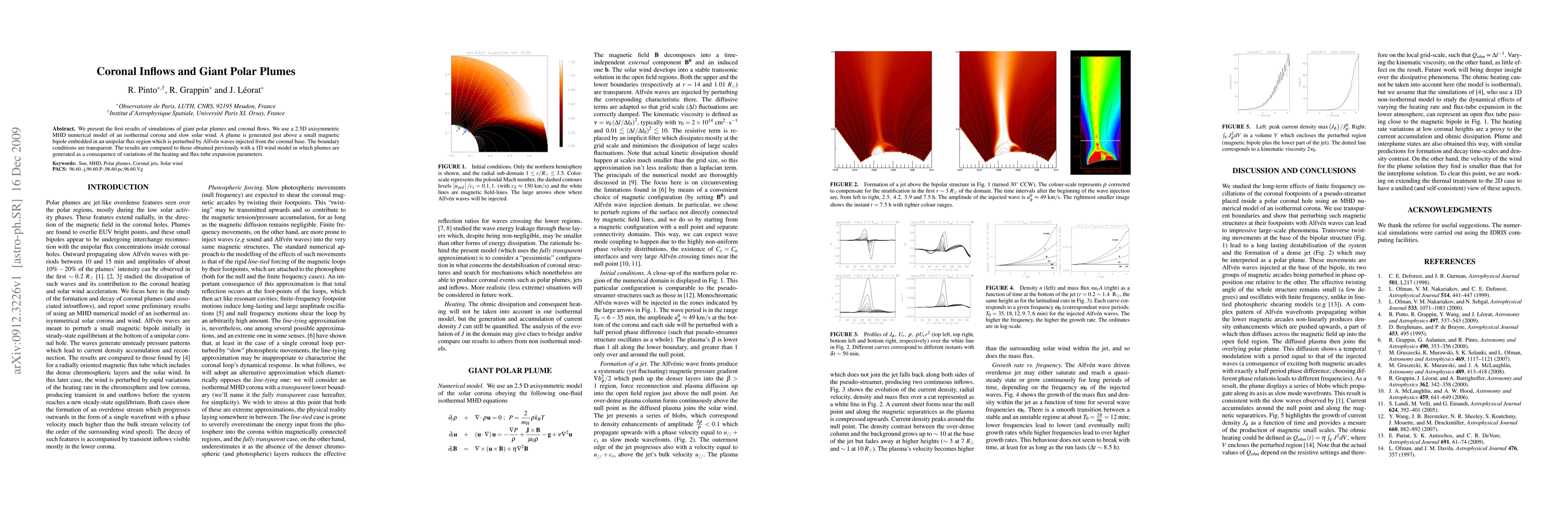 This paper presents the first results from 2.5D axisymmetric MHD simulations of giant polar plumes and coronal inflows, showing plumes generated above a magnetic bipole influenced by Alfvén waves. The findings are compared to previous 1D wind model results, highlighting differences in plume formation mechanisms.
