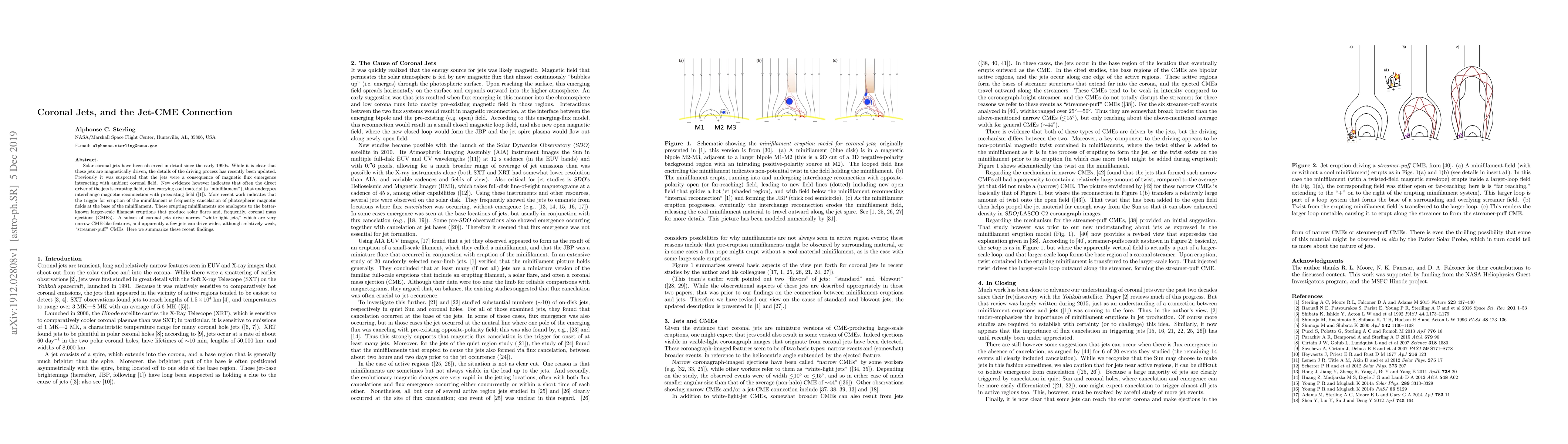 Recent studies reveal that solar coronal jets are often driven by erupting minifilaments undergoing magnetic reconnection, triggered by photospheric magnetic field cancelation. Some jets can produce narrow white-light jets or wider, weaker streamer-puff coronal mass ejections, linking them to larger-scale filament eruptions.