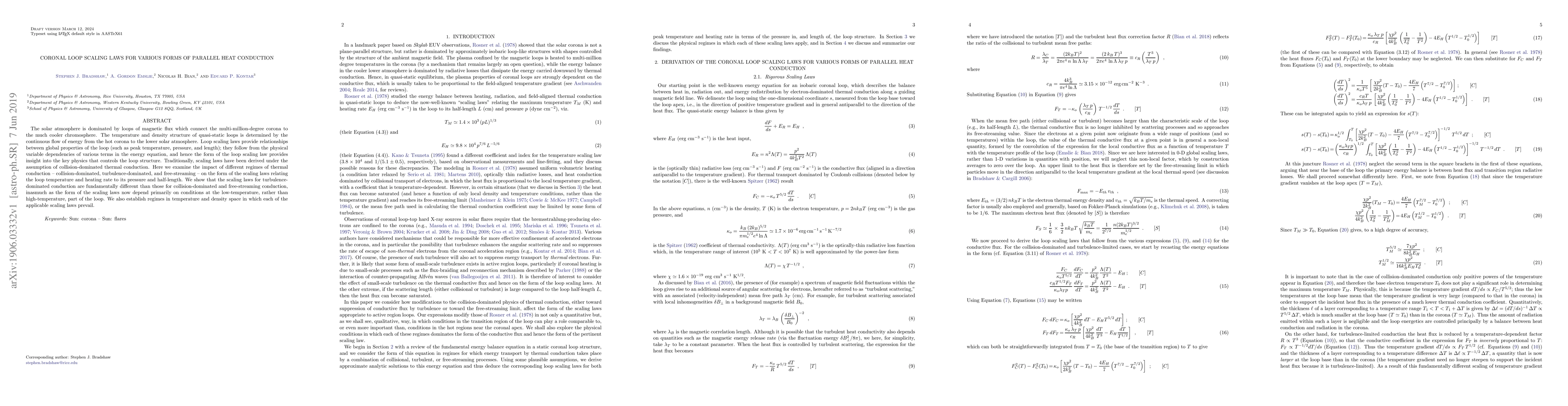 This paper investigates how different forms of parallel heat conduction—collision-dominated, turbulence-dominated, and free-streaming—affect the scaling laws of solar coronal loops. It reveals that turbulence-dominated conduction leads to fundamentally different scaling laws compared to collision-dominated and free-streaming conduction, emphasizing conditions at the cooler end of the loop.