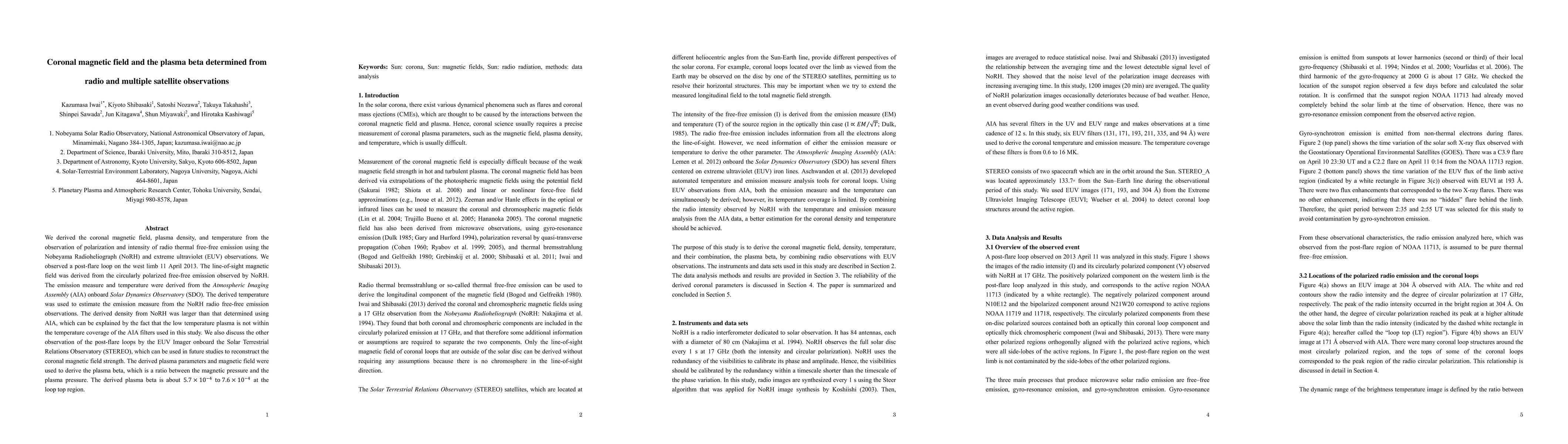 We derived the coronal magnetic field, plasma density, and temperature from the observation of polarization and intensity of radio thermal free-free emission using the Nobeyama Radioheliograph (NoRH) and extreme ultraviolet (EUV) observations. We observed a post-flare loop on the west limb 11 April 2013. The line-of-sight magnetic field was derived from the circularly polarized free-free emission observed by NoRH. The emission measure and temperature were derived from the Atmospheric Imaging Assembly (AIA) onboard Solar Dynamics Observatory (SDO). The derived temperature was used to estimate the emission measure from the NoRH radio free-free emission observations. The derived density from NoRH was larger than that determined using AIA, which can be explained by the fact that the low temperature plasma is not within the temperature coverage of the AIA filters used in this study. We also discuss the other observation of the post-flare loops by the EUV Imager onboard the Solar Terrestrial Relations Observatory (STEREO), which can be used in future studies to reconstruct the coronal magnetic field strength. The derived plasma parameters and magnetic field were used to derive the plasma beta, which is a ratio between the magnetic pressure and the plasma pressure. The derived plasma beta is about 5.7*10^(-4) to 7.6*10^(-4) at the loop top region.