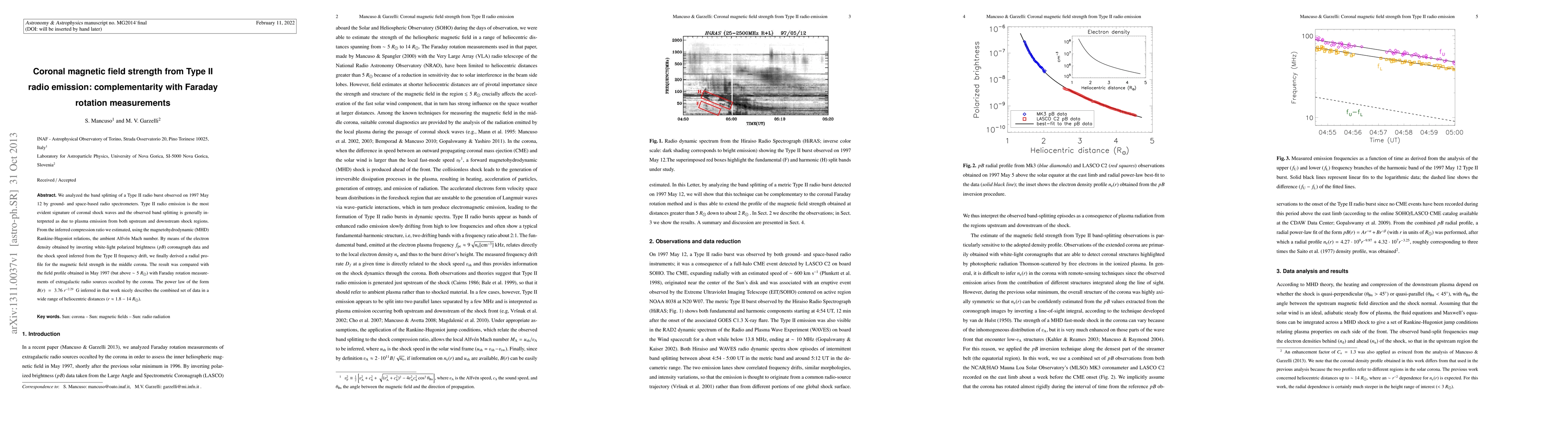 We analyzed the band splitting of a Type II radio burst observed on 1997 May 12 by ground- and space-based radio spectrometers. Type II radio emission is the most evident signature of coronal shock waves and the observed band splitting is generally interpreted as due to plasma emission from both upstream and downstream shock regions. From the inferred compression ratio we estimated, using the magnetohydrodynamic (MHD) Rankine-Hugoniot relations, the ambient Alfven Mach number. By means of the electron density obtained by inverting white-light polarized brightness (pB) coronagraph data and the shock speed inferred from the Type II frequency drift, we finally derived a radial profile for the magnetic field strength in the middle corona. The result was compared with the field profile obtained in May 1997 (but above $\sim 5 R_{sun}$) with Faraday rotation measurements of extragalactic radio sources occulted by the corona. The power law of the form $B(r)$ = 3.76 $r^{-2.29}$ Gauss inferred in that work nicely describes the combined set of data in a wide range of heliocentric distances ($r$ $\sim$ 1.8 - 14 $R_{sun}$).
