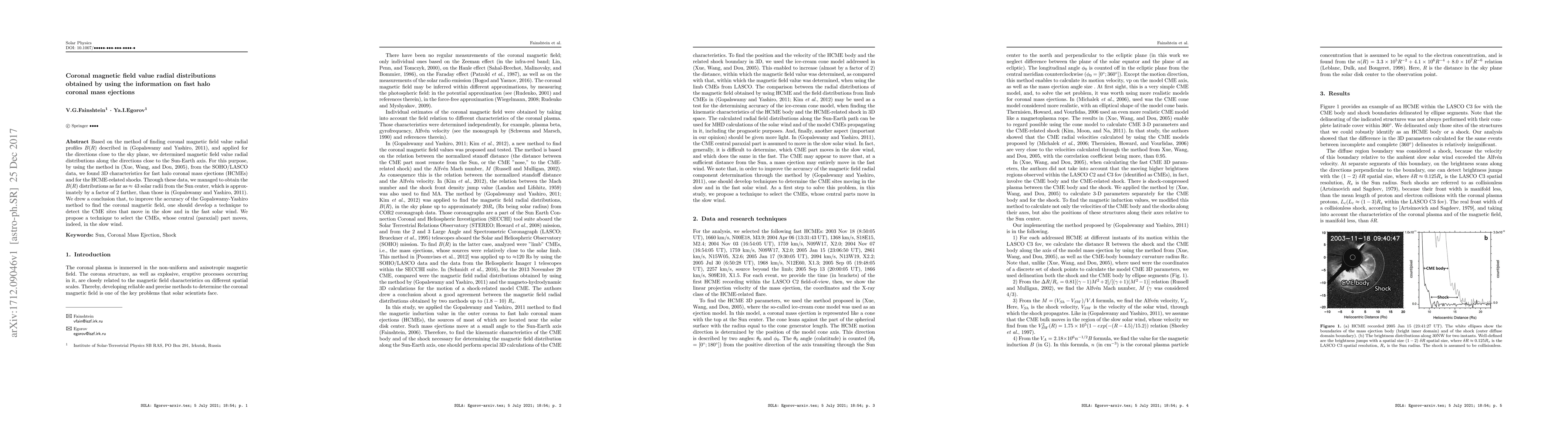 Based on the method of finding coronal magnetic field value radial profiles B(R) described in (Gopalswamy and Yashiro, 2011), and applied for the directions close to the sky plane, we determined magnetic field value radial distributions along the directions close to the Sun-Earth axis. For this purpose, by using the method in (Xue, Wang, and Dou, 2005), from the SOHO/LASCO data, we found 3D characteristics for fast halo coronal mass ejections (HCMEs) and for the HCME-related shocks. Through these data, we managed to obtain the B(R) distributions as far as 43 solar radii from the Sun center, which is approximately by a factor of 2 farther, than those in (Gopalswamy and Yashiro, 2011). We drew a conclusion that, to improve the accuracy of the Gopalswamy-Yashiro method to find the coronal magnetic field, one should develop a technique to detect the CME sites that move in the slow and in the fast solar wind. We propose a technique to select the CMEs, whose central (paraxial) part moves, indeed, in the slow wind.