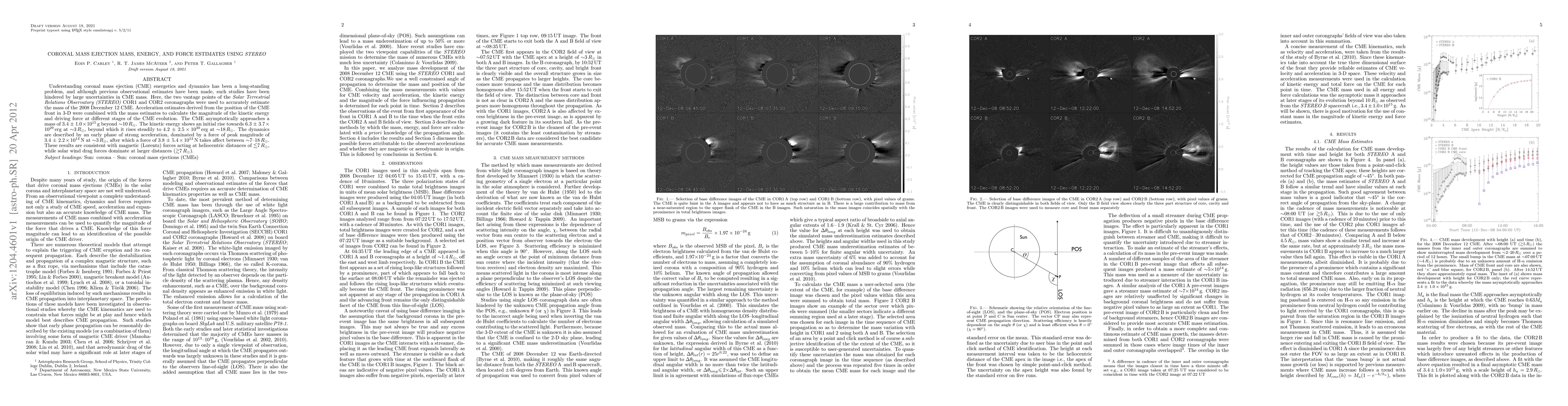 This study utilizes STEREO's COR1 and COR2 coronagraphs to accurately estimate the mass and calculate the kinetic energy and driving force of the 2008 December 12 CME. It finds a CME mass of 3.4±1.0x10^15 g, kinetic energy rising to 6.3±3.7x10^29 erg at ~3 R_sun and 4.2±2.5x10^30 erg at ~18 R_sun, and describes dynamics influenced by magnetic forces near the Sun and solar wind drag at larger distances.