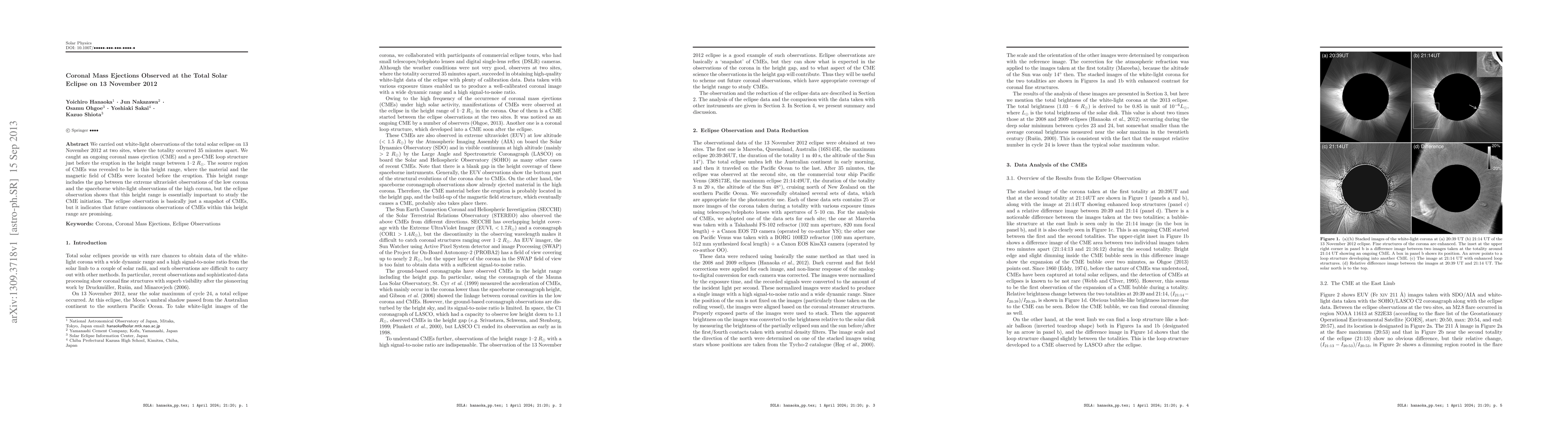 We carried out white-light observations of the total solar eclipse on 13 November 2012 at two sites, where the totality occurred 35 minutes apart. We caught an ongoing coronal mass ejection (CME) and a pre-CME loop structure just before the eruption in the height range between 1-2 R_sun. The source region of CMEs was revealed to be in this height range, where the material and the magnetic field of CMEs were located before the eruption. This height range includes the gap between the extreme ultraviolet observations of the low corona and the spaceborne white-light observations of the high corona, but the eclipse observation shows that this height range is essentially important to study the CME initiation. The eclipse observation is basically just a snapshot of CMEs, but it indicates that future continuous observations of CMEs within this height range are promising.