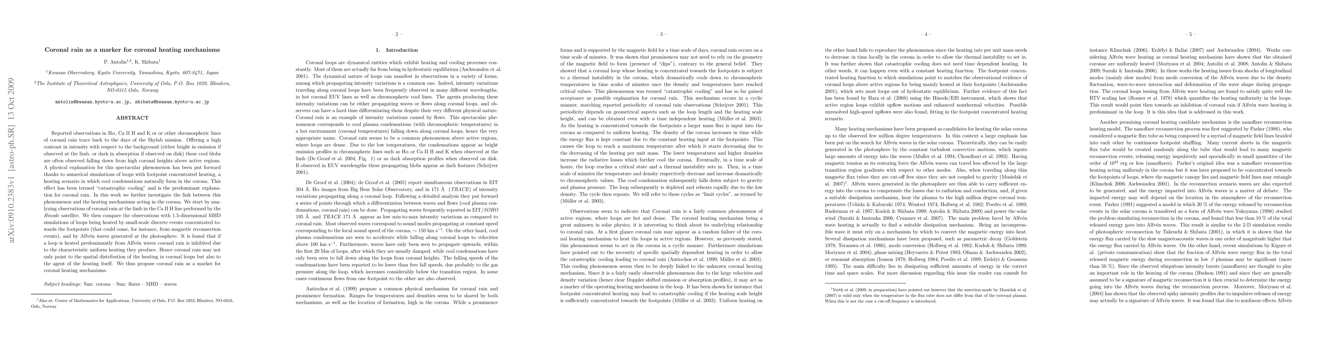 Reported observations in H-alpha, Ca II H and K or or other chromospheric lines of coronal rain trace back to the days of the Skylab mission. Offering a high contrast in intensity with respect to the background (either bright in emission if observed at the limb, or dark in absorption if observed on disk) these cool blobs are often observed falling down from high coronal heights above active regions. A physical explanation for this spectacular phenomenon has been put forward thanks to numerical simulations of loops with footpoint concentrated heating, a heating scenario in which cool condensations naturally form in the corona. This effect has been termed 'catastrophic cooling' and is the predominant explanation for coronal rain. In this work we further investigate the link between this phenomenon and the heating mechanisms acting in the corona. We start by analyzing observations of coronal rain at the limb in the Ca II H line performed by the SOT instrument on board of the Hinode satellite. We then compare the observations with 1.5-dimensional MHD simulations of loops being heated by small-scale discrete events concentrated towards the footpoints (that could come, for instance, from magnetic reconnection events), and by Alfven waves generated at the photosphere. It is found that if a loop is heated predominantly from Alfven waves coronal rain is inhibited due to the characteristic uniform heating they produce. Hence coronal rain may not only point to the spatial distribution of the heating in coronal loops but also to the agent of the heating itself. We thus propose coronal rain as a marker for coronal heating mechanisms.