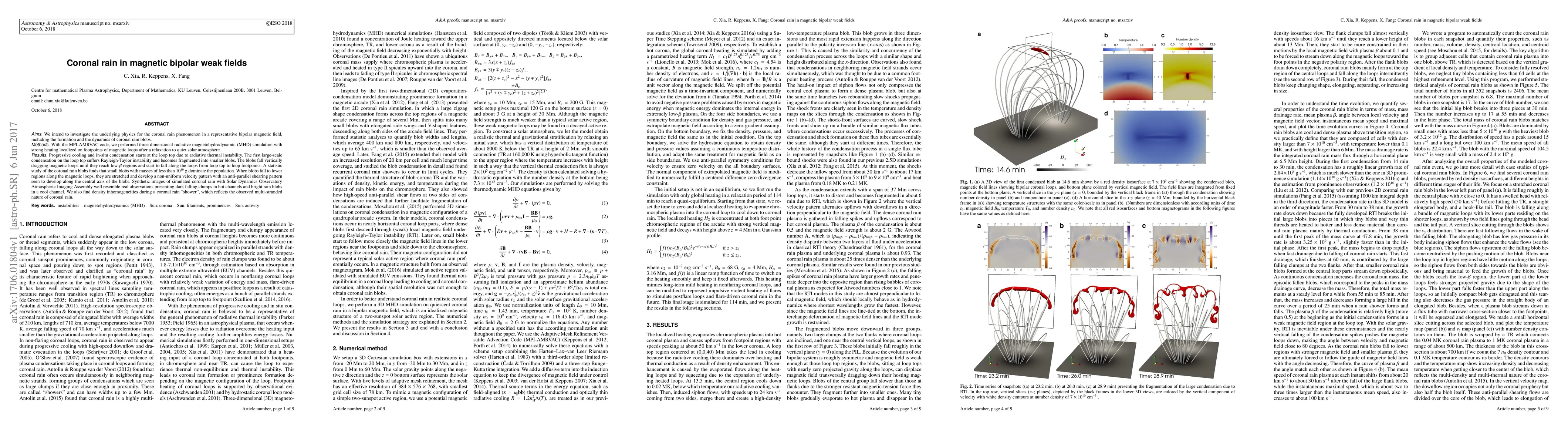 This study uses 3D MHD simulations to explore the physics of coronal rain in weak bipolar magnetic fields, revealing the formation and fragmentation of coronal rain blobs due to radiative thermal instability and Rayleigh-Taylor instability. The simulations show that small blobs dominate and exhibit non-uniform velocity patterns as they descend along magnetic loops, closely matching observed phenomena.