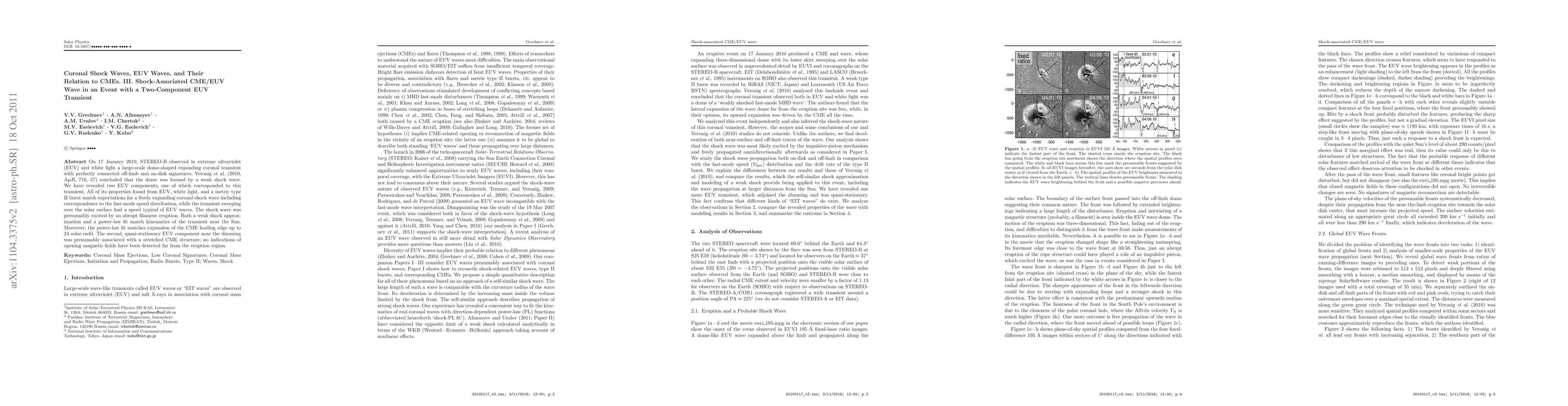 This paper investigates a coronal shock wave and its relation to a coronal mass ejection (CME) observed on 17 January 2010, revealing two distinct EUV components. The transient shock wave corresponds to a freely expanding coronal shock, while the second EUV component is linked to a quasi-stationary CME structure, suggesting no significant magnetic field changes far from the eruption site.