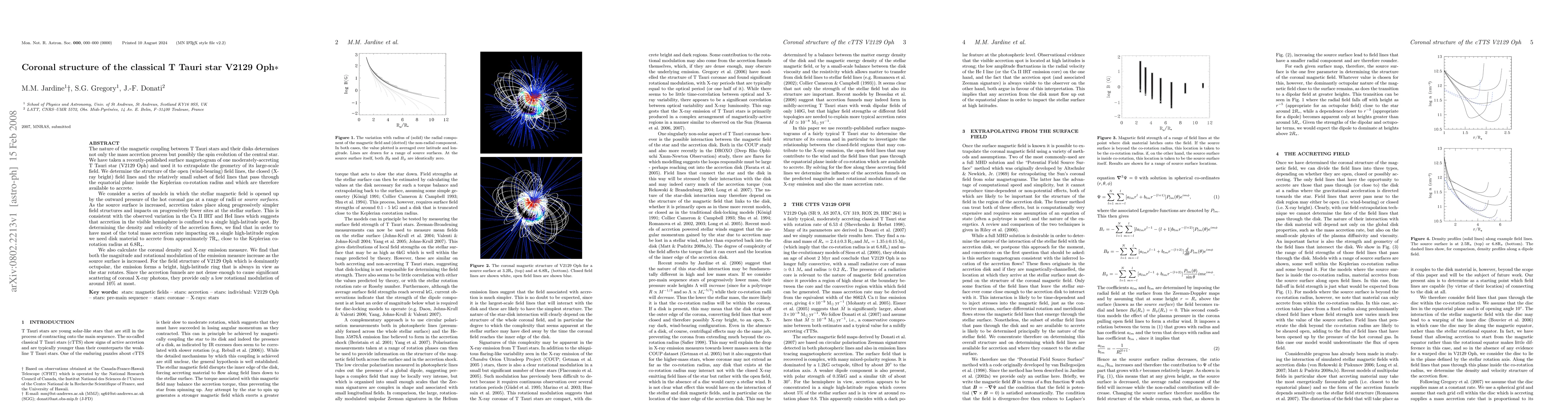 The nature of the magnetic coupling between T Tauri stars and their disks determines not only the mass accretion process but possibly the spin evolution of the central star. We have taken a recently-published surface magnetogram of one moderately-accreting T Tauri star (V2129 Oph) and used it to extrapolate the geometry of its large-scale field. We determine the structure of the open (wind-bearing) field lines, the closed (X-ray bright) field lines and those potentially accreting field lines that pass through the equatorial plane inside the Keplerian co-rotation radius. We consider a series of models in which the stellar magnetic field is opened up by the outward pressure of the hot coronal gas at a range of radii. As this radius is increased, accretion takes place along simpler field structures and impacts on fewer sites at the stellar surface. This is consistent with the observed variation in the Ca II IRT and HeI lines which suggests that accretion in the visible hemisphere is confined to a single high-latitude spot. By determining the density and velocity of the accretion flows, we find that in order to have most of the total mass accretion rate impacting on a single high-latitude region we need disk material to accrete from approximately 7R*, close to the Keplerian co-rotation radius at 6.8R*. We also calculate the coronal density and X-ray emission measure. We find that both the magnitude and rotational modulation of the emission measure increase as the source surface is increased. For the field structure of V2129 Oph which is dominantly octupolar, the emission forms a bright, high-latitude ring that is always in view as the star rotates. Since the accretion funnels are not dense enough to cause significant scattering of coronal X-ray photons, they provide only a low rotational modulation of around 10% at most.