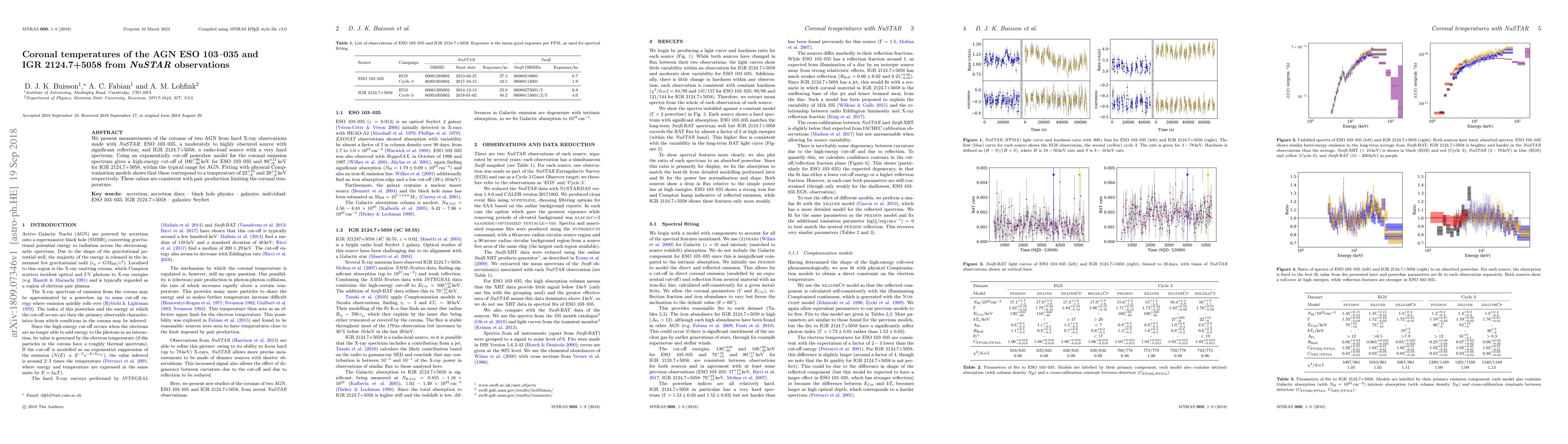We present measurements of the coronae of two AGN from hard X-ray observations made with NuSTAR: ESO 103-035, a moderately to highly obscured source with significant reflection; and IGR 2124.7+5058, a radio-loud source with a very hard spectrum. Using an exponentially cut-off powerlaw model for the coronal emission spectrum gives a high-energy cut-off of $100_{-30}^{+90}$ keV for ESO 103-035 and $80_{-9}^{+11}$ keV for IGR 2124.7+5058, within the typical range for AGN. Fitting with physical Comptonisation models shows that these correspond to a temperature of $22_{-6}^{+19}$ and $20_{-2}^{+3}$ keV respectively. These values are consistent with pair production limiting the coronal temperature.