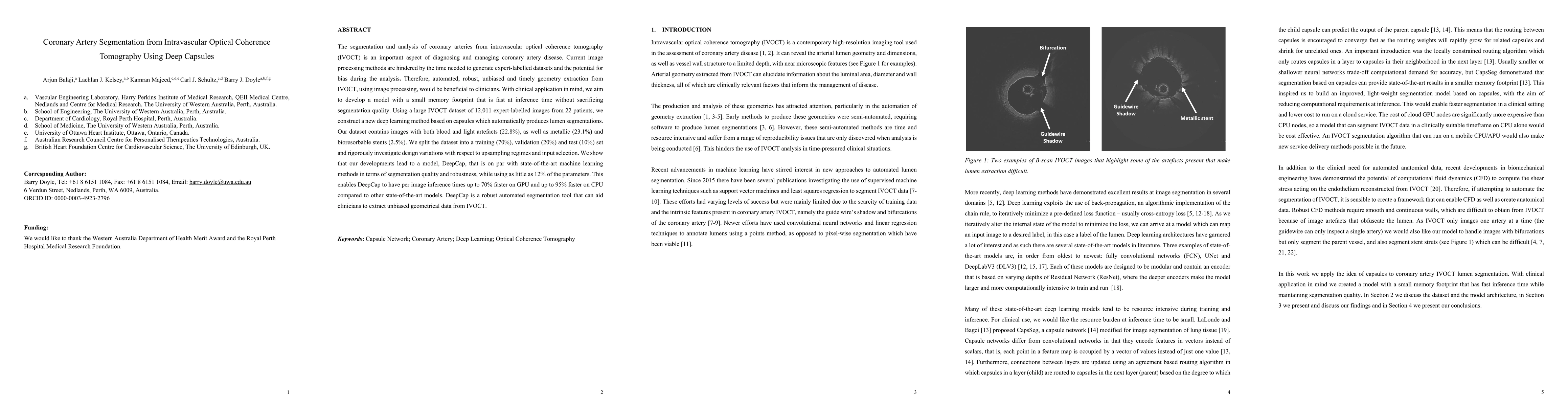 This paper presents DeepCap, a deep learning model based on capsule networks for segmenting coronary arteries from intravascular optical coherence tomography (IVOCT) images, achieving high segmentation quality and efficiency with a small memory footprint and fast inference times. The model is shown to be robust and comparable to state-of-the-art methods, offering a valuable tool for clinicians.