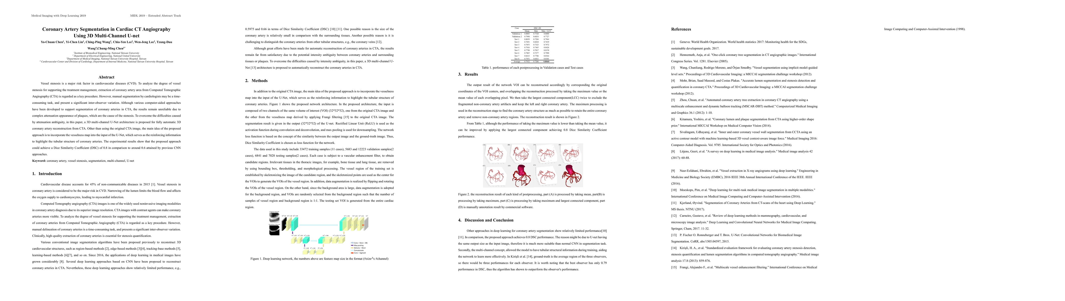 This paper proposes a 3D multi-channel U-Net architecture for automatic coronary artery segmentation in cardiac CT angiography, incorporating vesselness maps to enhance tubular structure highlighting. The method achieves a Dice Similarity Coefficient of 0.8, significantly improving upon previous CNN-based approaches.