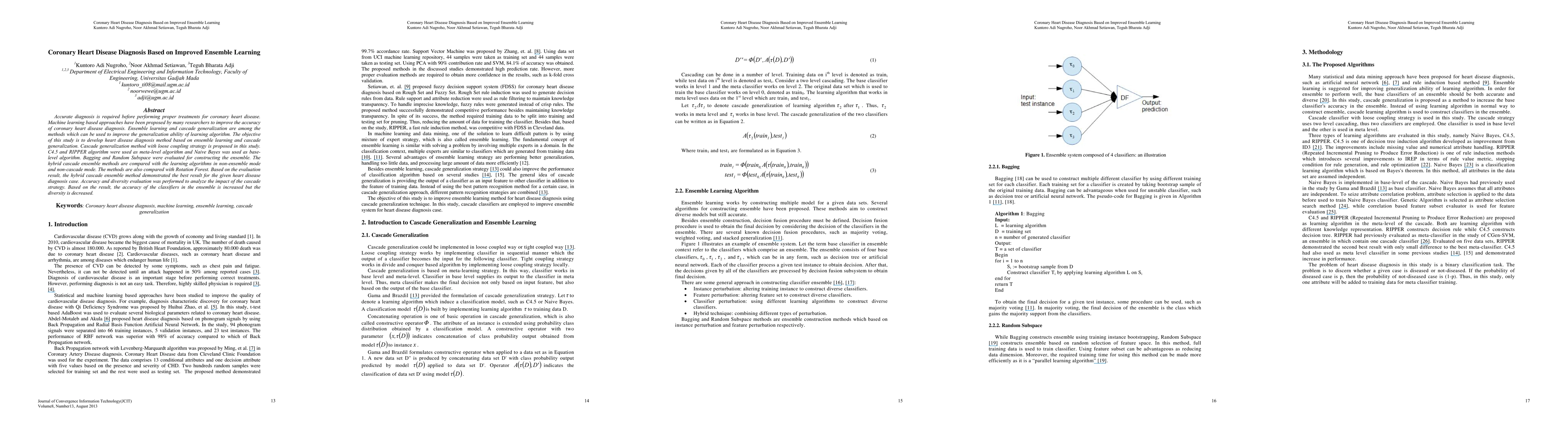 This study develops a coronary heart disease diagnosis method using an improved ensemble learning approach with cascade generalization. The hybrid method combines C4.5 and RIPPER algorithms with Naive Bayes, employing Bagging and Random Subspace techniques. Results show the proposed method improves accuracy over non-ensemble and non-cascade methods, though it slightly decreases diversity among classifiers.