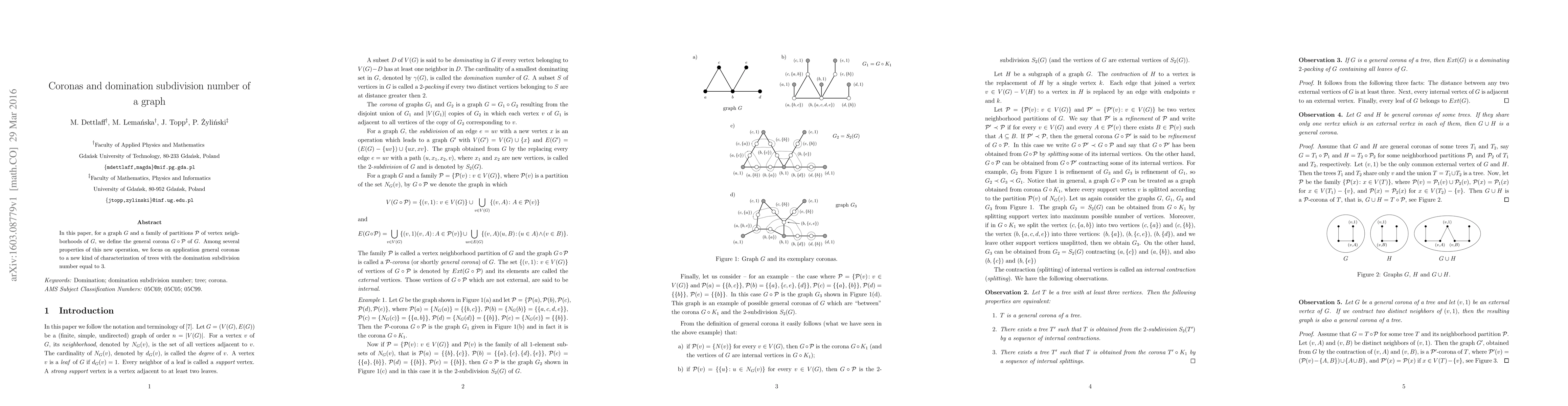 In this paper, for a graph G and a family of partitions P of vertex neighborhoods of G, we define the general corona G \circ P of G. Among several properties of this new operation, we focus on application general coronas to a new kind of characterization of trees with the domination subdivision number equal to 3.