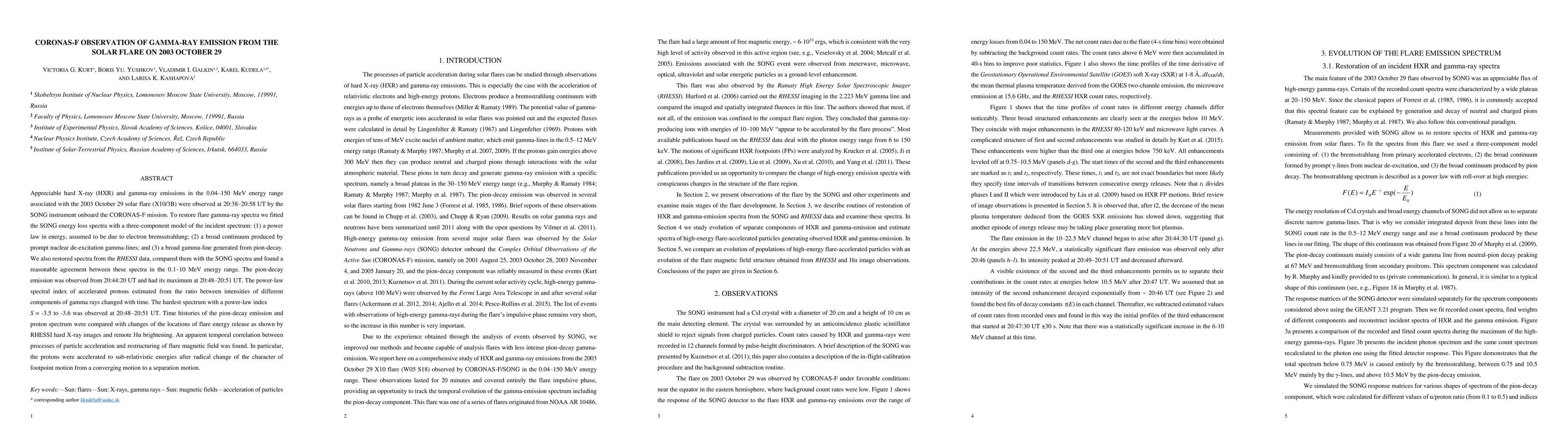 Appreciable hard X-ray (HXR) and gamma-ray emissions in the 0.04 to 150 MeV energy range associated with the 2003 October 29 solar flare (X10/3B) were observed at 20:38 to 20:58 UT by the SONG instrument onboard the CORONAS-F mission. To restore flare gamma-ray spectra we fitted the SONG energy loss spectra with a three-component model of the incident spectrum: (1) a power law in energy, assumed to be due to electron bremsstrahlung; (2) a broad continuum produced by prompt nuclear de-excitation gamma-lines; and (3) a broad gamma-line generated from pion decay. We also restored spectra from the RHESSI data, compared them with the SONG spectra and found a reasonable agreement between these spectra in the 0.1 to 10 MeV energy range. The pion-decay emission was observed from 20:44:20 UT and had its maximum at 20:48 to 20:51 UT. The power-law spectral index of accelerated protons estimated from the ratio between intensities of different components of gamma rays changed with time. The hardest spectrum with a power-law index S = - 3.5 to - 3.6 was observed at 20:48 to 20:51 UT. Time histories of the pion-decay emission and proton spectrum were compared with changes of the locations of flare energy release as shown by RHESSI hard X-ray images and remote H alpha brightening. An apparent temporal correlation between processes of particle acceleration and restructuring of flare magnetic field was found. In particular, the protons were accelerated to sub-relativistic energies after radical change of the character of footpoint motion from a converging motion to a separation motion.
