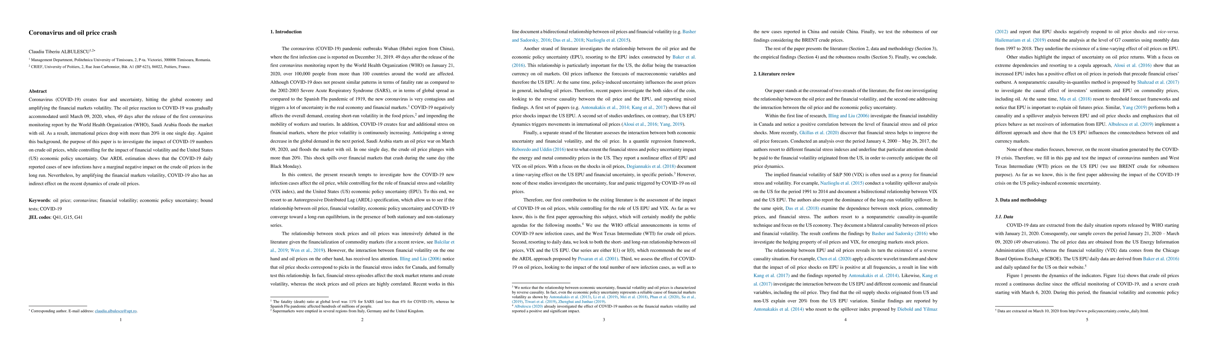 Coronavirus (COVID-19) creates fear and uncertainty, hitting the global economy and amplifying the financial markets volatility. The oil price reaction to COVID-19 was gradually accommodated until March 09, 2020, when, 49 days after the release of the first coronavirus monitoring report by the World Health Organization (WHO), Saudi Arabia floods the market with oil. As a result, international prices drop with more than 20% in one single day. Against this background, the purpose of this paper is to investigate the impact of COVID-19 numbers on crude oil prices, while controlling for the impact of financial volatility and the United States (US) economic policy uncertainty. Our ARDL estimation shows that the COVID-19 daily reported cases of new infections have a marginal negative impact on the crude oil prices in the long run. Nevertheless, by amplifying the financial markets volatility, COVID-19 also has an indirect effect on the recent dynamics of crude oil prices.