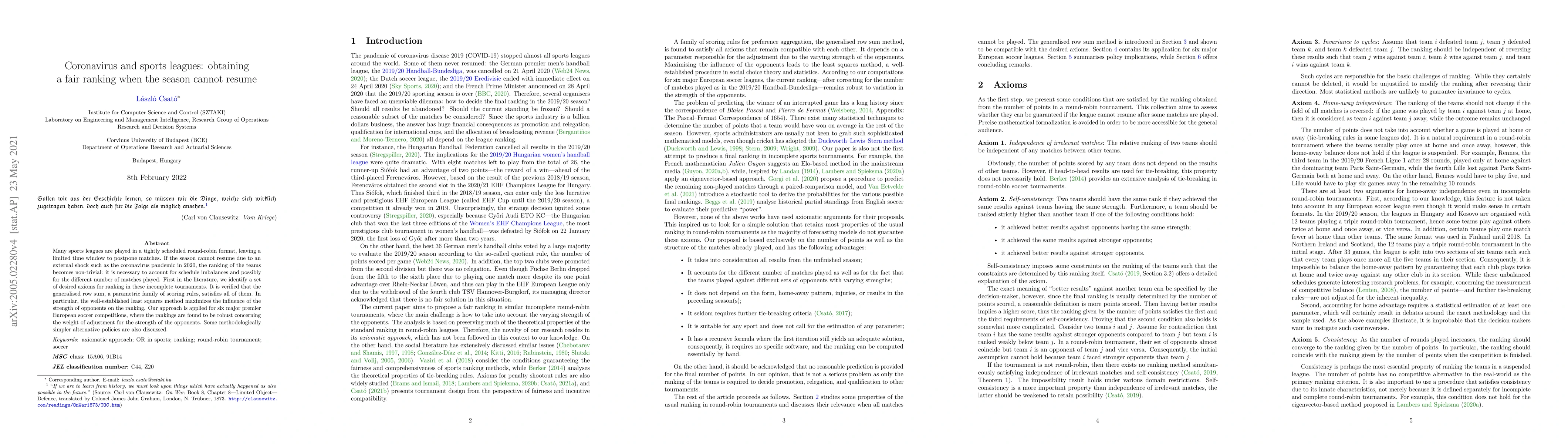 Many sports leagues are played in a tightly scheduled round-robin format, leaving a limited time window to postpone matches. If the season cannot resume due to an external shock such as the coronavirus pandemic in 2020, the ranking of the teams becomes non-trivial: it is necessary to account for schedule imbalances and possibly for the different number of matches played. First in the literature, we identify a set of desired axioms for ranking in these incomplete tournaments. It is verified that the generalised row sum, a parametric family of scoring rules, satisfies all of them. In particular, the well-established least squares method maximizes the influence of the strength of opponents on the ranking. Our approach is applied for six major premier European soccer competitions, where the rankings are found to be robust concerning the weight of adjustment for the strength of the opponents. Some methodologically simpler alternative policies are also discussed.