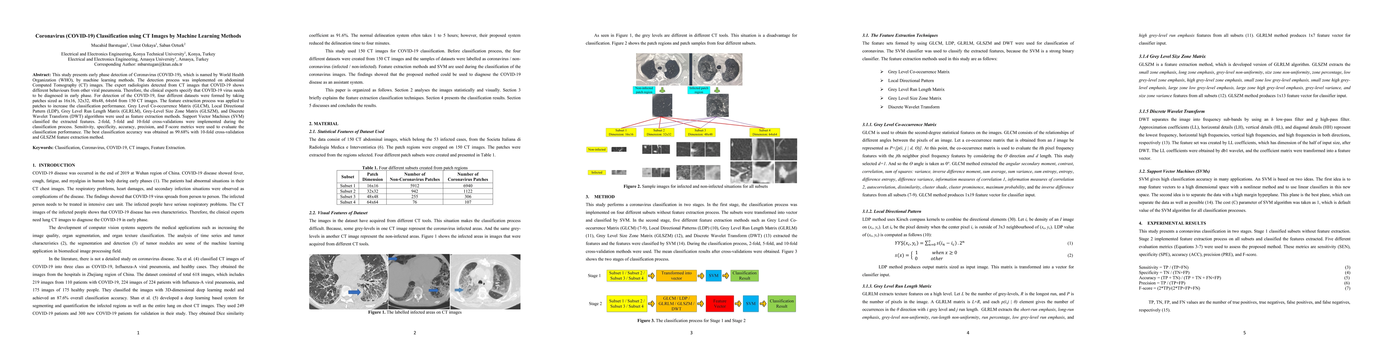 This study presents early phase detection of Coronavirus (COVID-19), which is named by World Health Organization (WHO), by machine learning methods. The detection process was implemented on abdominal Computed Tomography (CT) images. The expert radiologists detected from CT images that COVID-19 shows different behaviours from other viral pneumonia. Therefore, the clinical experts specify that COV\.ID-19 virus needs to be diagnosed in early phase. For detection of the COVID-19, four different datasets were formed by taking patches sized as 16x16, 32x32, 48x48, 64x64 from 150 CT images. The feature extraction process was applied to patches to increase the classification performance. Grey Level Co-occurrence Matrix (GLCM), Local Directional Pattern (LDP), Grey Level Run Length Matrix (GLRLM), Grey-Level Size Zone Matrix (GLSZM), and Discrete Wavelet Transform (DWT) algorithms were used as feature extraction methods. Support Vector Machines (SVM) classified the extracted features. 2-fold, 5-fold and 10-fold cross-validations were implemented during the classification process. Sensitivity, specificity, accuracy, precision, and F-score metrics were used to evaluate the classification performance. The best classification accuracy was obtained as 99.68% with 10-fold cross-validation and GLSZM feature extraction method.
