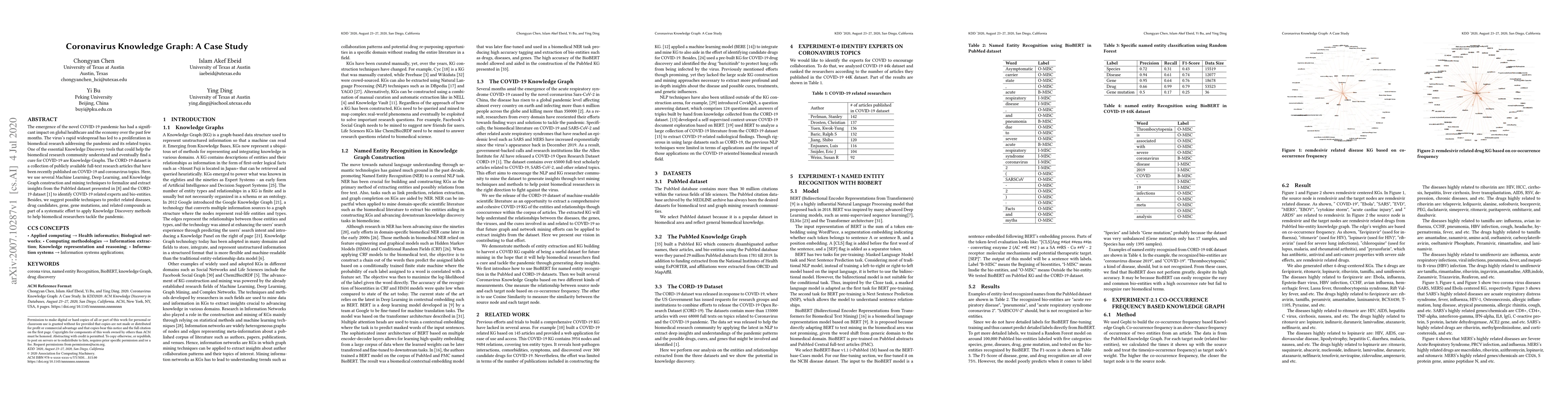The emergence of the novel COVID-19 pandemic has had a significant impact on global healthcare and the economy over the past few months. The virus's rapid widespread has led to a proliferation in biomedical research addressing the pandemic and its related topics. One of the essential Knowledge Discovery tools that could help the biomedical research community understand and eventually find a cure for COVID-19 are Knowledge Graphs. The CORD-19 dataset is a collection of publicly available full-text research articles that have been recently published on COVID-19 and coronavirus topics. Here, we use several Machine Learning, Deep Learning, and Knowledge Graph construction and mining techniques to formalize and extract insights from the PubMed dataset and the CORD-19 dataset to identify COVID-19 related experts and bio-entities. Besides, we suggest possible techniques to predict related diseases, drug candidates, gene, gene mutations, and related compounds as part of a systematic effort to apply Knowledge Discovery methods to help biomedical researchers tackle the pandemic.