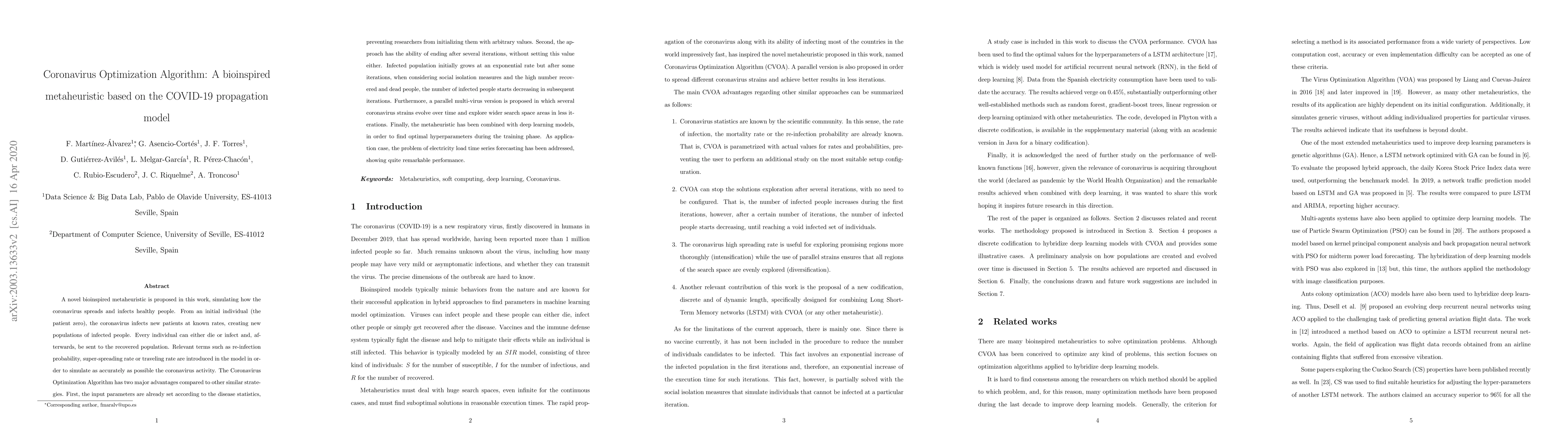 A novel bioinspired metaheuristic is proposed in this work, simulating how the coronavirus spreads and infects healthy people. From an initial individual (the patient zero), the coronavirus infects new patients at known rates, creating new populations of infected people. Every individual can either die or infect and, afterwards, be sent to the recovered population. Relevant terms such as re-infection probability, super-spreading rate or traveling rate are introduced in the model in order to simulate as accurately as possible the coronavirus activity. The Coronavirus Optimization Algorithm has two major advantages compared to other similar strategies. First, the input parameters are already set according to the disease statistics, preventing researchers from initializing them with arbitrary values. Second, the approach has the ability of ending after several iterations, without setting this value either. Infected population initially grows at an exponential rate but after some iterations, when considering social isolation measures and the high number recovered and dead people, the number of infected people starts decreasing in subsequent iterations. Furthermore, a parallel multi-virus version is proposed in which several coronavirus strains evolve over time and explore wider search space areas in less iterations. Finally, the metaheuristic has been combined with deep learning models, in order to find optimal hyperparameters during the training phase. As application case, the problem of electricity load time series forecasting has been addressed, showing quite remarkable performance.