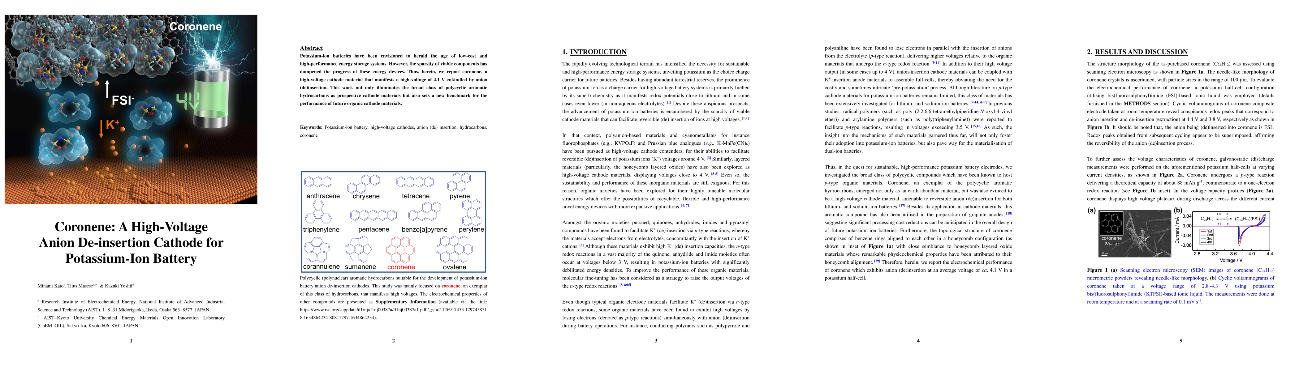 Summary: This paper introduces coronene as a high-voltage anion de-insertion cathode material for potassium-ion batteries, achieving a voltage of 4.1 V and highlighting polycyclic aromatic hydrocarbons as potential future organic cathode materials.