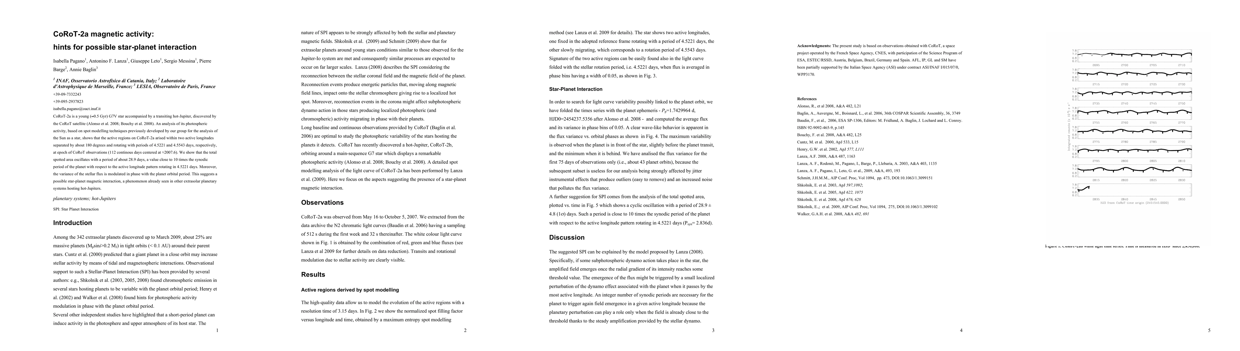 CoRoT-2a is a young (about 0.5 Gyr) G7V star accompanied by a transiting hot-Jupiter, discovered by the CoRoT satellite (Alonso et al. 2008; Bouchy et al. 2008). An analysis of its photospheric activity, based on spot modelling techniques previously developed by our group for the analysis of the Sun as a star, shows that the active regions on CoRoT-2a arised within two active longitudes separated by about 180 degrees and rotating with periods of 4.5221 and 4.5543 days, respectively, at epoch of CoRoT observations (112 continous days centered at 2007.6). We show that the total spotted area oscillates with a period of about about 8.9 days, a value close to 10 times the synodic period of the planet with respect to the active longitude pattern rotating in 4.5221 days. Moreover, the variance of the stellar flux is modulated in phase with the planet orbital period. This suggests a possible star-planet magnetic interaction, a phenomenon already seen in other extrasolar planetary systems hosting hot-Jupiters.
