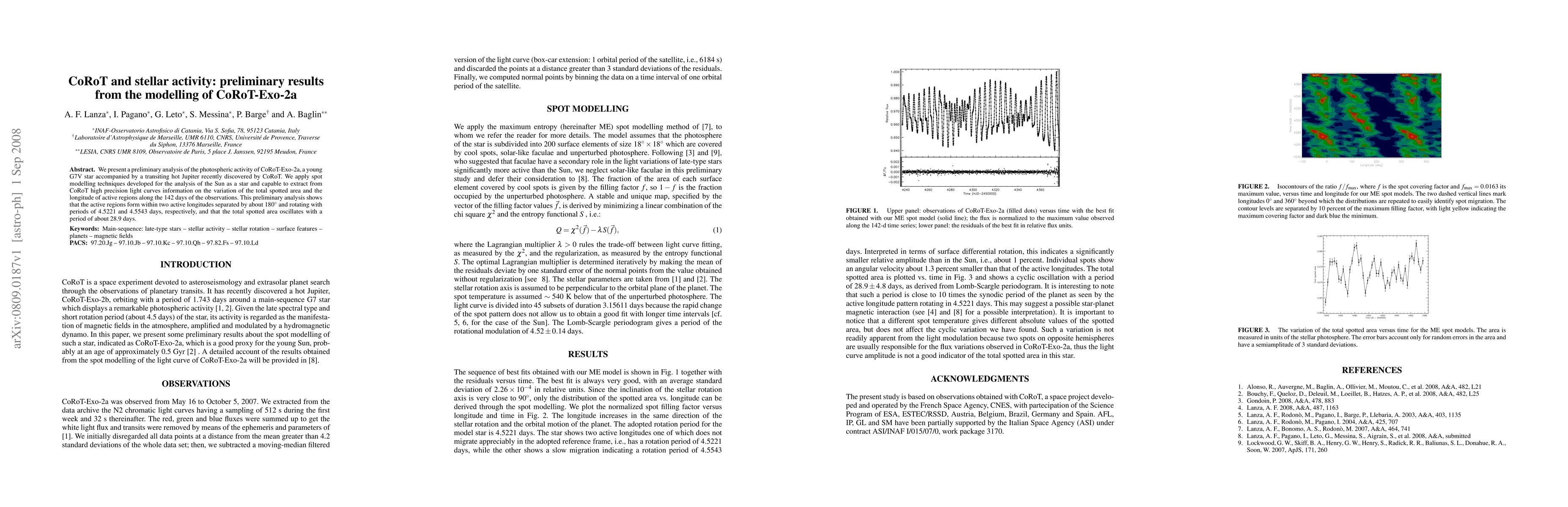 We present a preliminary analysis of the photospheric activity of CoRoT-Exo-2a, a young G7V star accompanied by a transiting hot Jupiter recently discovered by CoRoT. We apply spot modelling techniques developed for the analysis of the Sun as a star and capable to extract from CoRoT high precision light curves information on the variation of the total spotted area and the longitude of active regions along the 142 days of the observations. This preliminary analysis shows that the active regions form within two active longitudes separated by about 180 degrees and rotating with periods of 4.5221 and 4.5543 days, respectively, and that the total spotted area oscillates with a period of about 28.9 days.