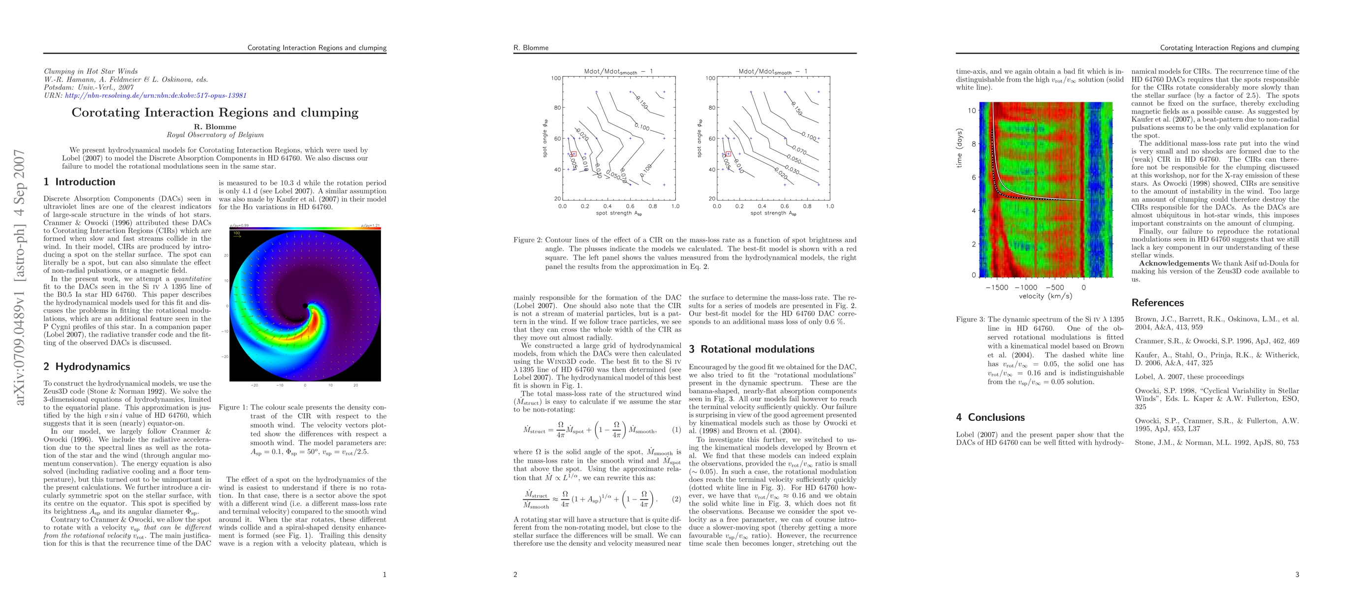 This paper presents hydrodynamical models for Corotating Interaction Regions (CIRs) to explain Discrete Absorption Components in HD 64760, but it fails to account for the rotational modulations observed in the star.
