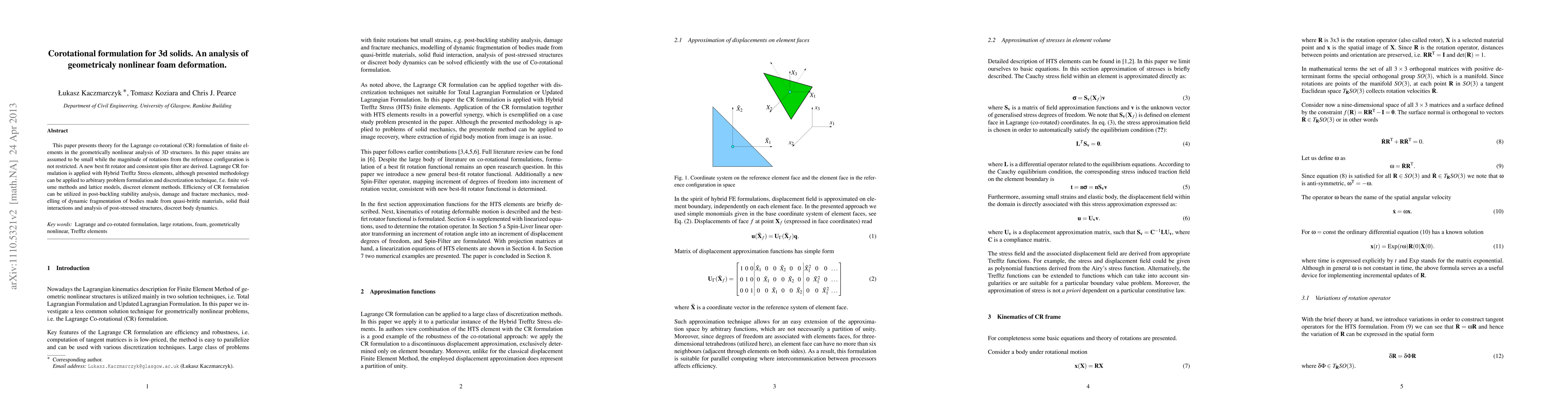 This paper presents theory for the Lagrange co-rotational (CR) formulation of finite elements in the geometrically nonlinear analysis of 3D structures. In this paper strains are assumed to be small while the magnitude of rotations from the reference configuration is not restricted. A new best fit rotator and consistent spin filter are derived. Lagrange CR formulation is applied with Hybrid Trefftz Stress elements, although presented methodology can be applied to arbitrary problem formulation and discretization technique, f.e. finite volume methods and lattice models, discreet element methods. Efficiency of CR formulation can be utilized in post-buckling stability analysis, damage and fracture mechanics, modelling of dynamic fragmentation of bodies made from quasi-brittle materials, solid fluid interactions and analysis of post-stressed structures, discreet body dynamics.