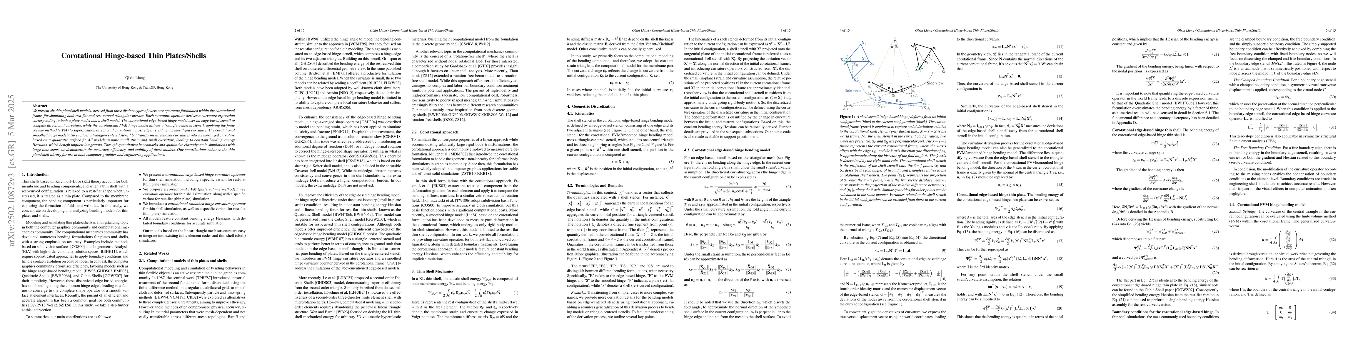 The paper introduces corotational hinge-based thin plates/shells, each with distinct curvature computation methods (edge-based, FVM, and smoothed), ensuring constant bending energy Hessians for efficient implicit integration.
