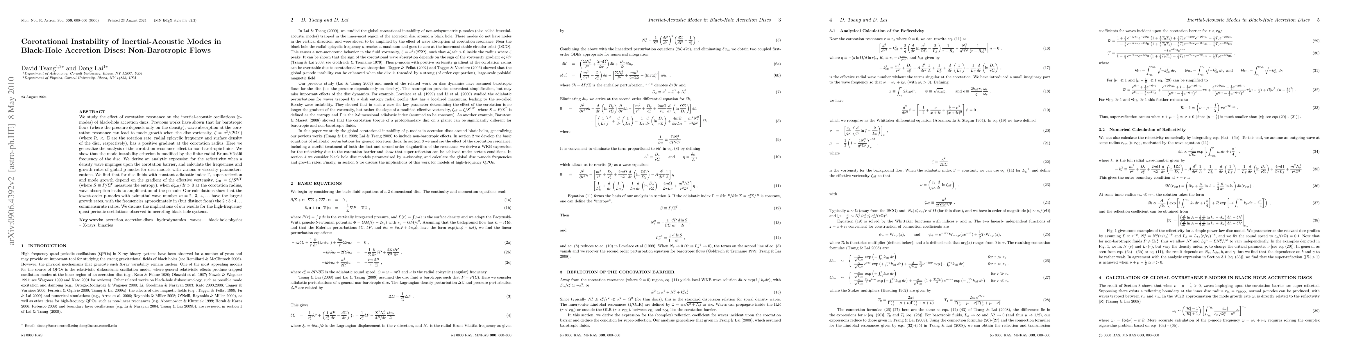 We study the effect of corotation resonance on the inertial-acoustic oscillations (p-modes) of black-hole accretion discs. Previous works have shown that for barotropic flows (where the pressure depends only on the density), wave absorption at the corotation resonance can lead to mode growth when the disc vortensity, $\zeta=\kappa^2/(2\Omega\Sigma)$ (where $\Omega, \kappa, \Sigma$ are the rotation rate, radial epicyclic frequency and surface density of the disc, respectively), has a positive gradient at the corotation radius. Here we generalize the analysis of the corotation resonance effect to non-barotropic fluids. We show that the mode instability criterion is modified by the finite radial Brunt-V\"as\"al\"a frequency of the disc. We derive an analytic expression for the reflectivity when a density wave impinges upon the corotation barrier, and calculate the frequencies and growth rates of global p-modes for disc models with various $\alpha$-viscosity parameterizations. We find that for disc fluids with constant adiabatic index $\Gamma$, super-reflection and mode growth depend on the gradient of the effective vortensity, $\zeta_{\rm eff} = \zeta/S^{2/\Gamma}$ (where $S \equiv P/\Sigma^{\Gamma}$ measures the entropy): when $d\zeta_{\rm eff}/dr > 0$ at the corotation radius, wave absorption leads to amplification of the p-mode. Our calculations show that the lowest-order p-modes with azimuthal wave number $m=2, 3, 4,...$ have the largest growth rates, with the frequencies approximately in (but distinct from) the $2:3:4...$ commensurate ratios. We discuss the implications of our results for the high-frequency quasi-periodic oscillations observed in accreting black-hole systems.