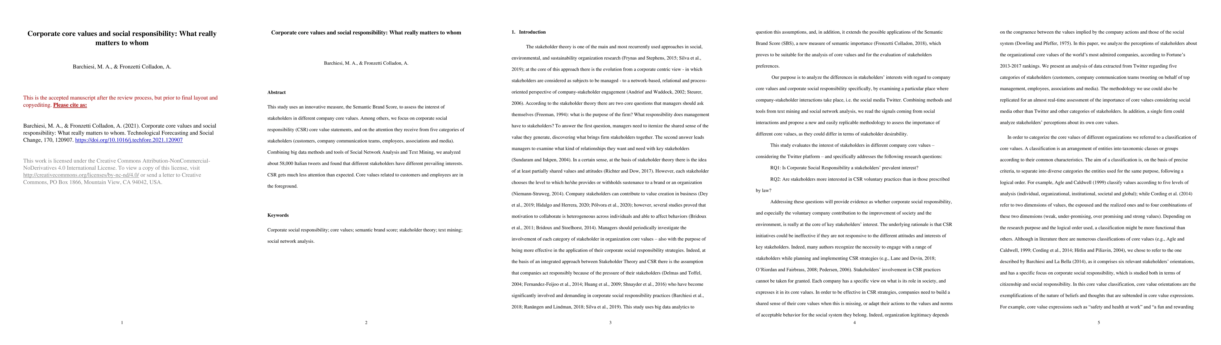 This study employs the Semantic Brand Score to evaluate stakeholder interest in company core values, particularly corporate social responsibility (CSR), across five categories. Analysis of 58,000 Italian tweets reveals that CSR receives less attention than anticipated, while core values related to customers and employees are prioritized by stakeholders.