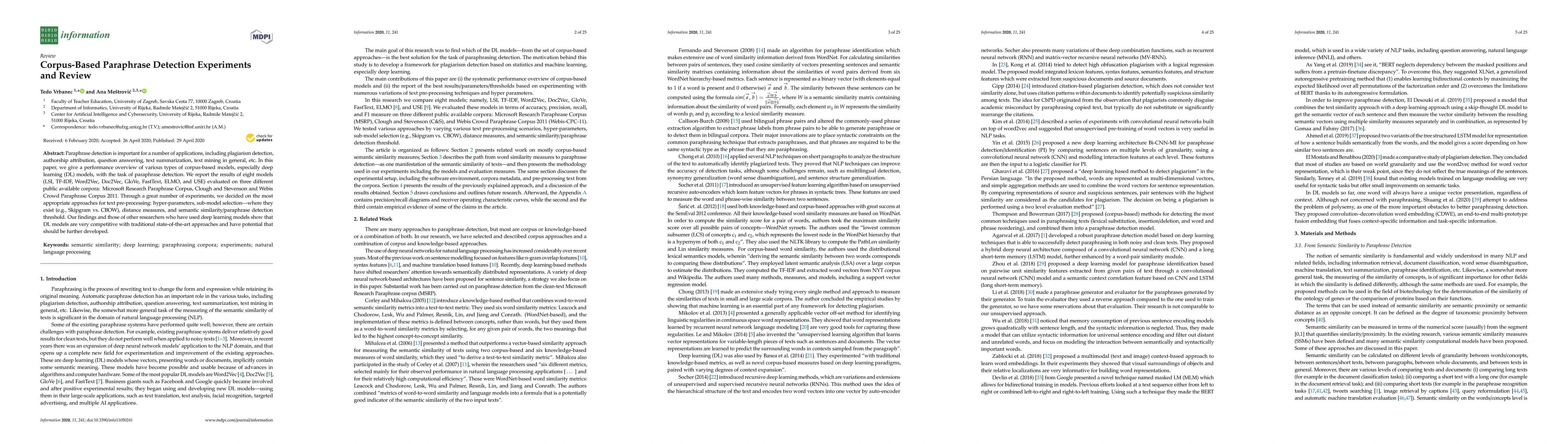 This paper reviews and compares the performance of various corpus-based models, including deep learning approaches, for paraphrase detection across multiple datasets. It concludes that deep learning models are competitive with traditional methods and offer promising potential for future development.