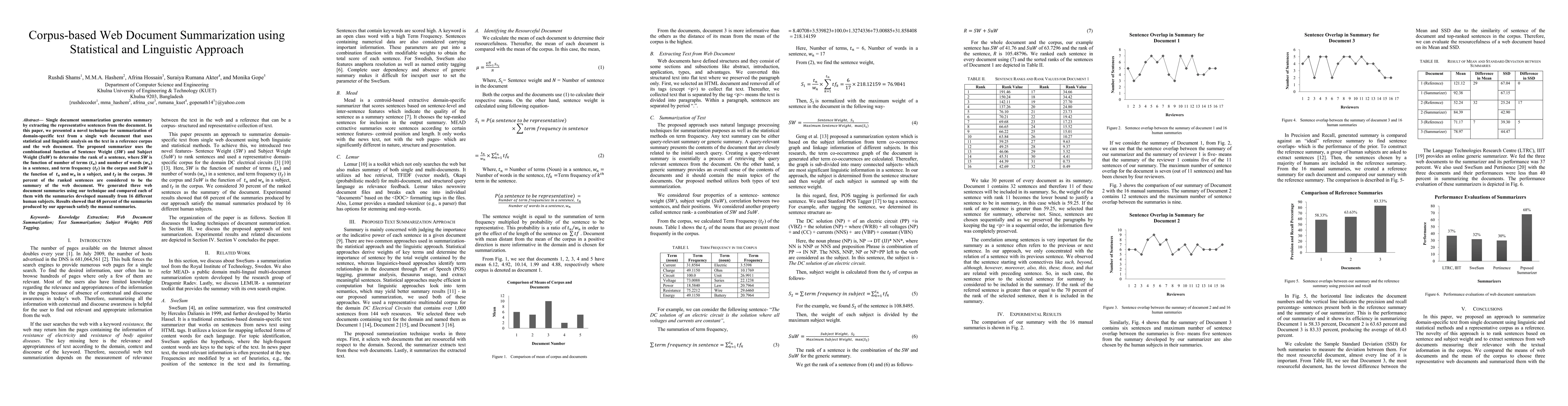 This paper introduces a novel summarization technique for domain-specific web documents using statistical and linguistic analysis. The method ranks sentences based on Sentence Weight and Subject Weight, extracting the top 30% as the summary, which was found to match 68% of manually created summaries from human subjects.