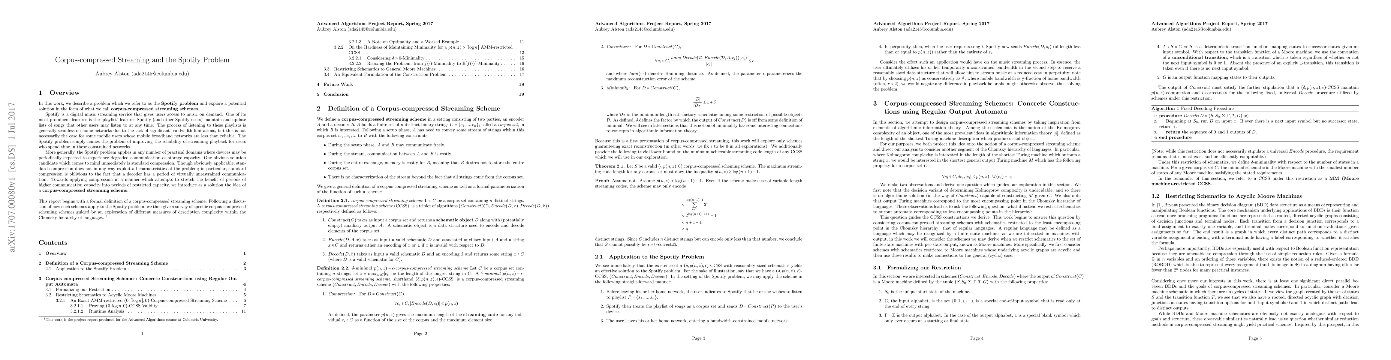 In this work, we describe a problem which we refer to as the \textbf{Spotify problem} and explore a potential solution in the form of what we call corpus-compressed streaming schemes. Inspired by the problem of constrained bandwidth during use of the popular Spotify application on mobile networks, the Spotify problem applies in any number of practical domains where devices may be periodically expected to experience degraded communication or storage capacity. One obvious solution candidate which comes to mind immediately is standard compression. Though obviously applicable, standard compression does not in any way exploit all characteristics of the problem; in particular, standard compression is oblivious to the fact that a decoder has a period of virtually unrestrained communication. Towards applying compression in a manner which attempts to stretch the benefit of periods of higher communication capacity into periods of restricted capacity, we introduce as a solution the idea of a corpus-compressed streaming scheme. This report begins with a formal definition of a corpus-compressed streaming scheme. Following a discussion of how such schemes apply to the Spotify problem, we then give a survey of specific corpus-compressed scheming schemes guided by an exploration of different measures of description complexity within the Chomsky hierarchy of languages.