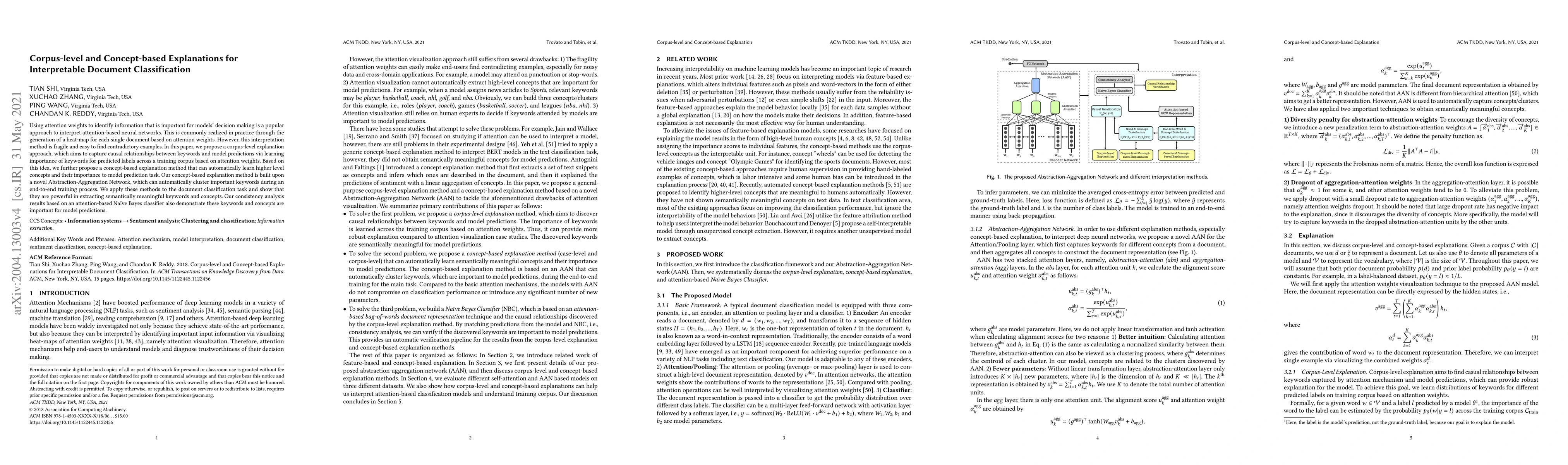 This paper proposes two new methods for interpreting document classification models: a corpus-level approach that captures causal relationships between keywords and model predictions, and a concept-based explanation method using an Abstraction-Aggregation Network to automatically learn higher-level concepts.