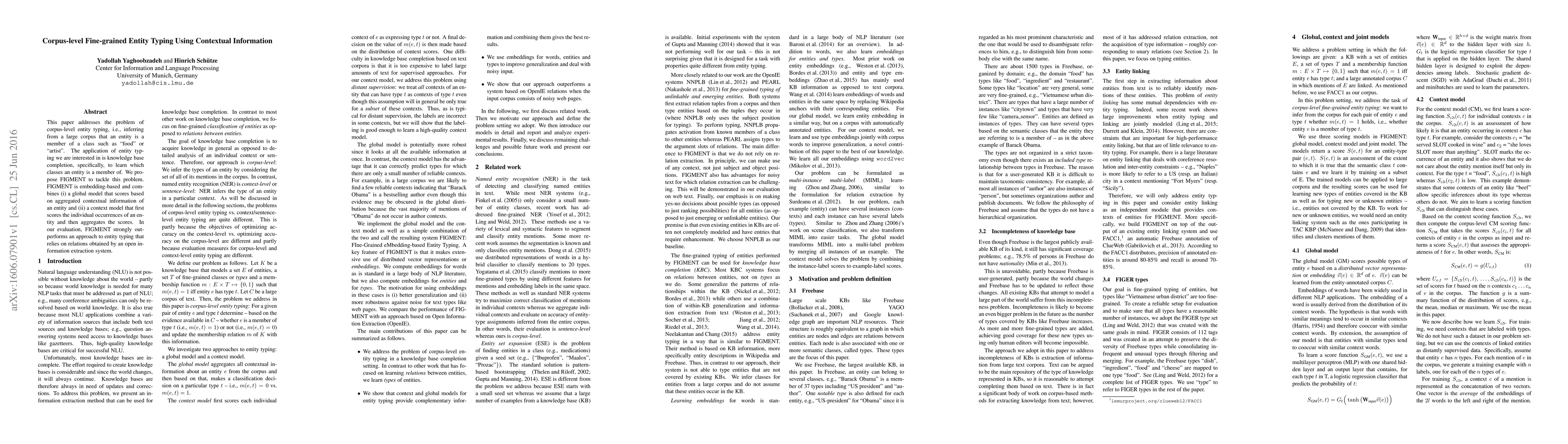 This paper introduces FIGMENT, a novel embedding-based approach for corpus-level fine-grained entity typing, combining global and context-based models to infer entity classes for knowledge base completion. FIGMENT outperforms traditional relation-based methods in entity typing tasks.