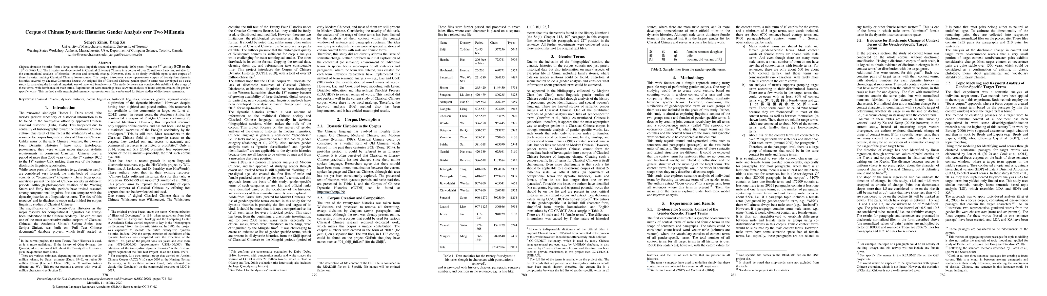 This paper introduces an open-source corpus of twenty-four Chinese dynastic histories, analyzing gender-specific terms over 2000 years. The study reveals stable usage of male terms with minimal female term representation, utilizing keyword analysis for semantic insights.